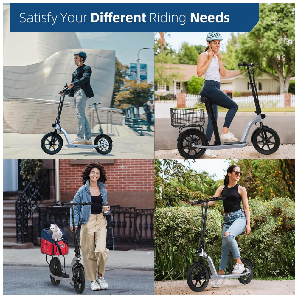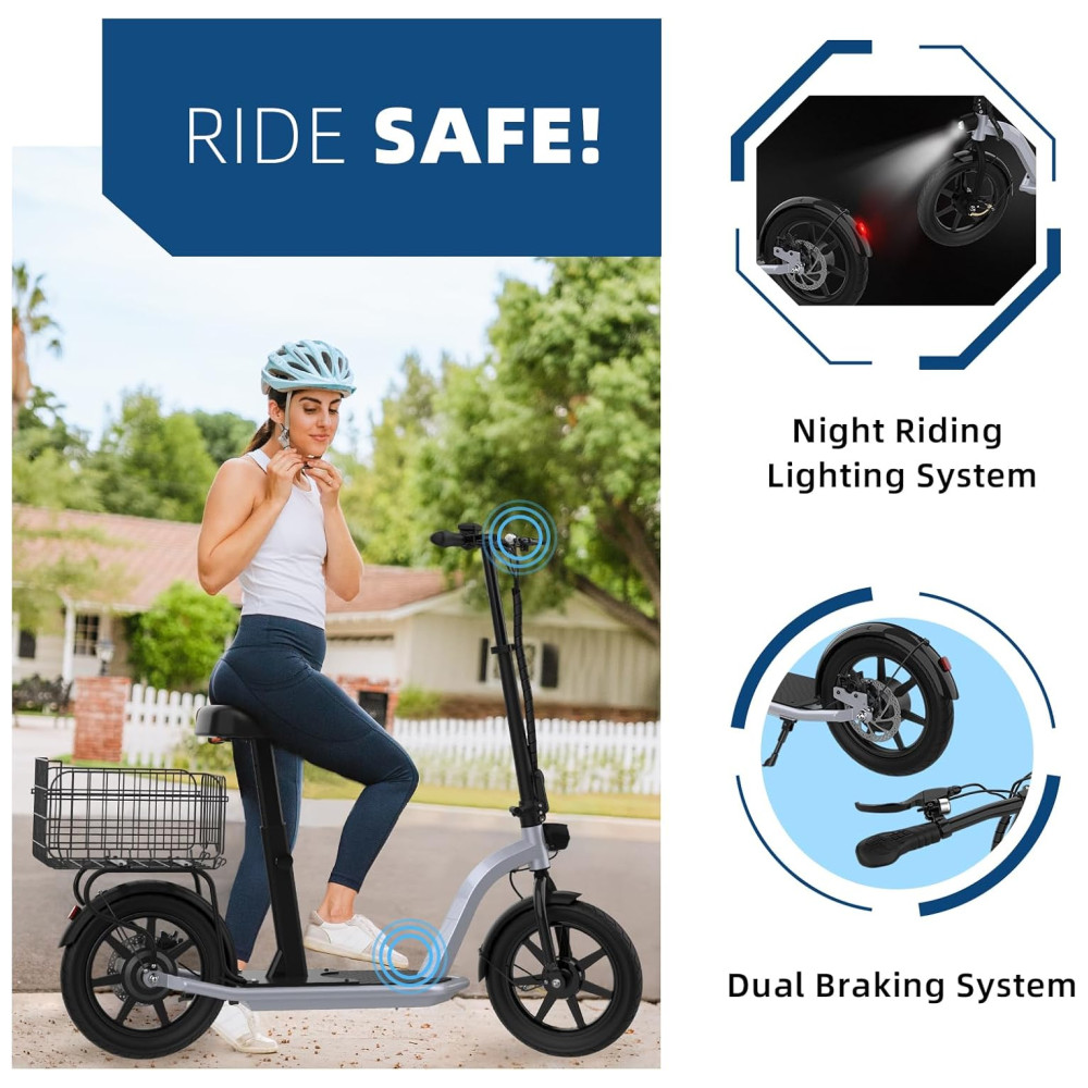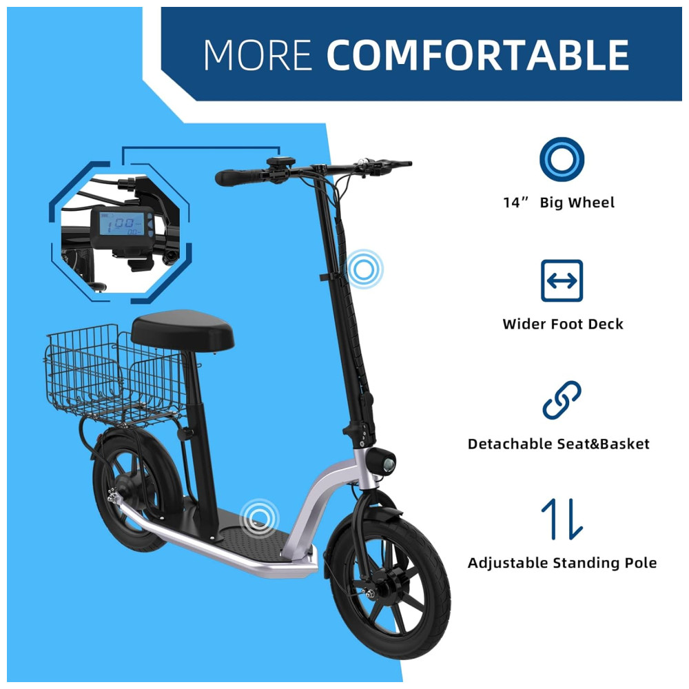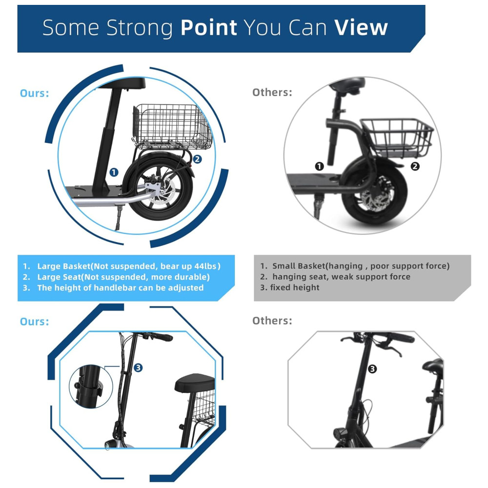 Nova versão atualizada da scooter Equipada com assento e cesto destacáveis, a scooter elétrica ECOM 14 proporciona uma experiência de condução mais confortável. É mais conveniente para você embalar e carregar alguns suprimentos diários.