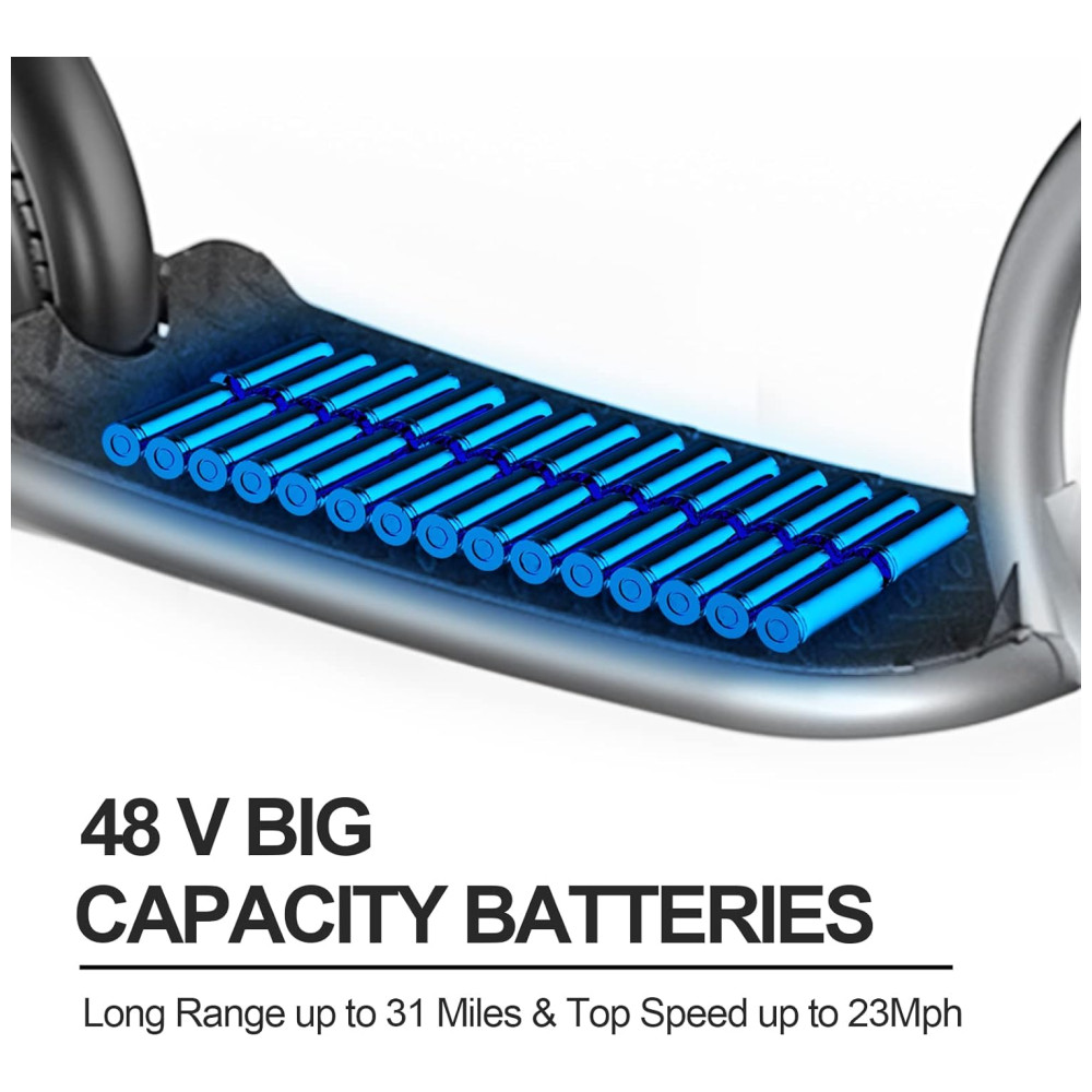 Mais forte e mais rápido O motor de cubo sem escova elétrico de 500 W permite velocidades de até 37 km. Equipado com bateria de alta capacidade 48V, 10AH, esta scooter elétrica com autonomia máxima de até 50 km sob condições específicas e carga máxima de 100 kg.