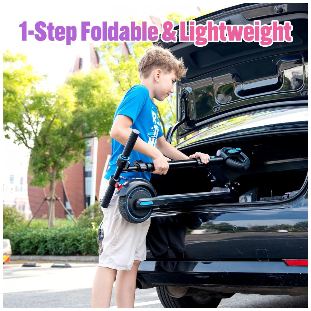 DOBRÁVEL E PORTÁTIL Devido ao avançado sistema de dobramento em uma etapa, as crianças podem dobrar sozinhas sem a ajuda dos pais. O design leve de 22 libras torna mais fácil para as crianças carregar a scooter para cima e para baixo nas escadas, o que reduz muito o fardo para os pais