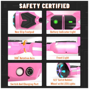 LUZES LED COLORIDAS E MODERNAS – Equipado com luzes LED vibrantes em 6 cores diferentes que piscam aleatoriamente, o hoverboard garante um visual moderno e estiloso. Os indicadores de LED também facilitam o monitoramento da vida útil da bateria e do status do hoverboard, proporcionando tranquilidade a cada aventura.