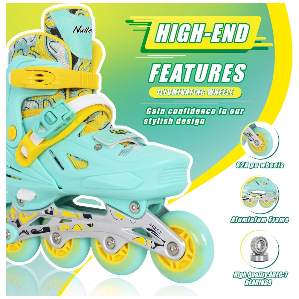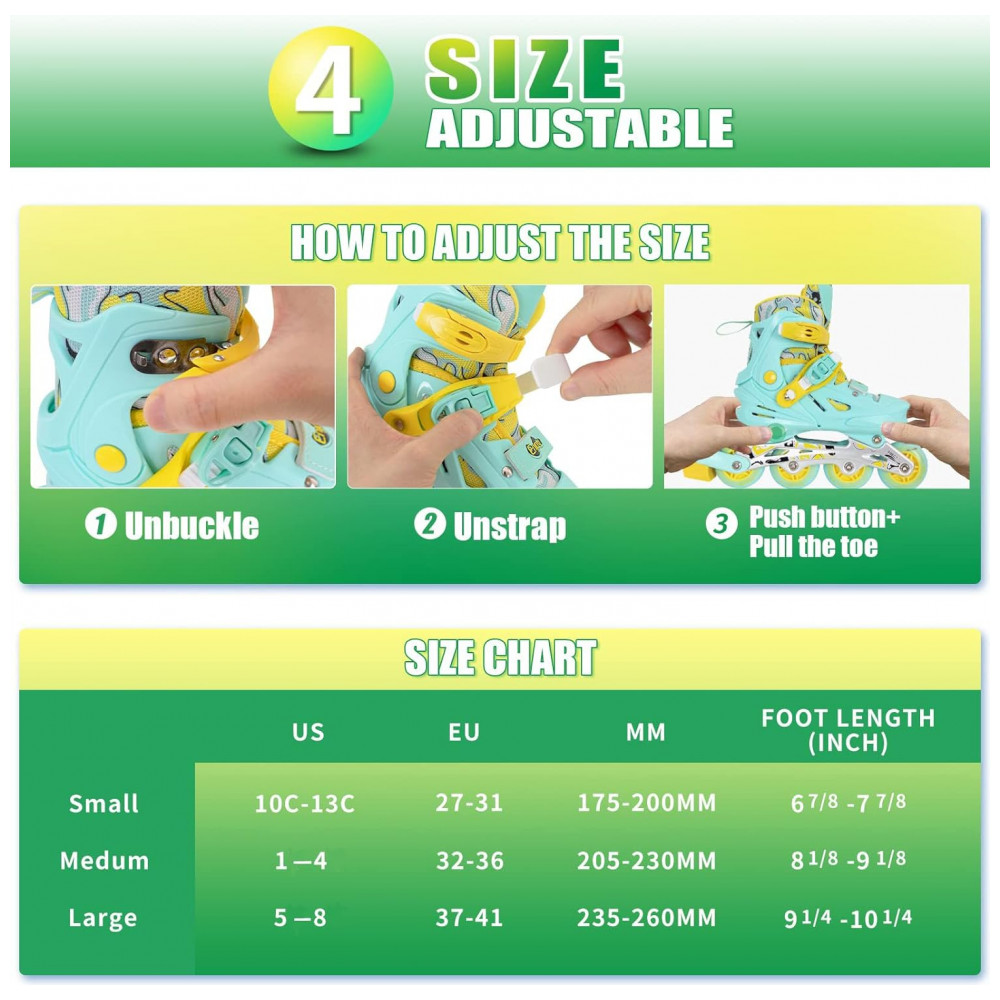 Rodas Iluminadas: Os patins em linha são equipados com 8 rodas iluminadas, todas acendendo e proporcionando uma exibição colorida do arco íris quando seu filho começa a andar de skate. As luzes são alimentadas pelas rodas em movimento e nunca precisam de substituição de baterias Dicas: verifique e aperte as rodas regularmente para evitar que caiam