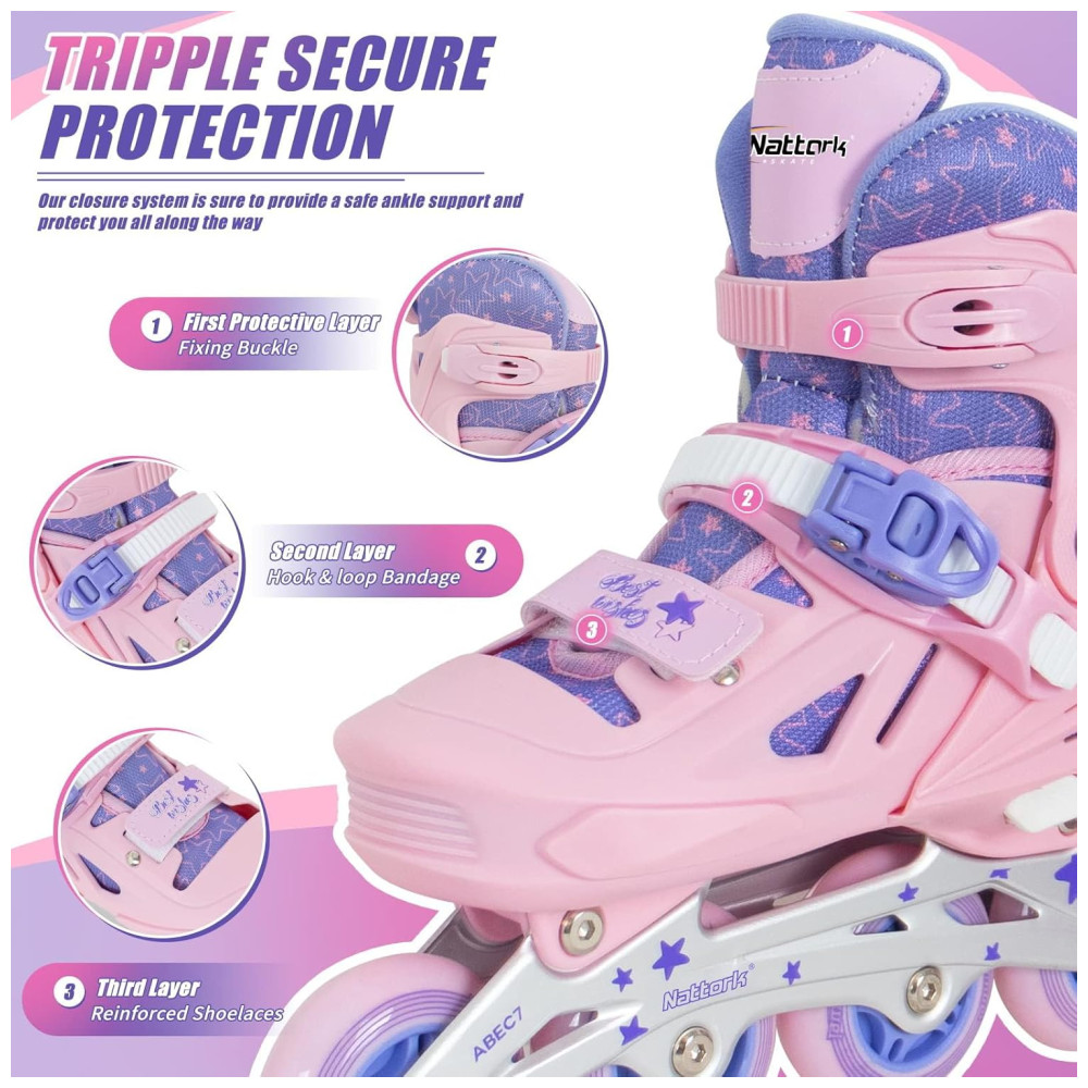 Patins Infantil Regulável com Rodas Iluminadas para Iniciantes Tam BR 30 a 34 Nattork Rosa