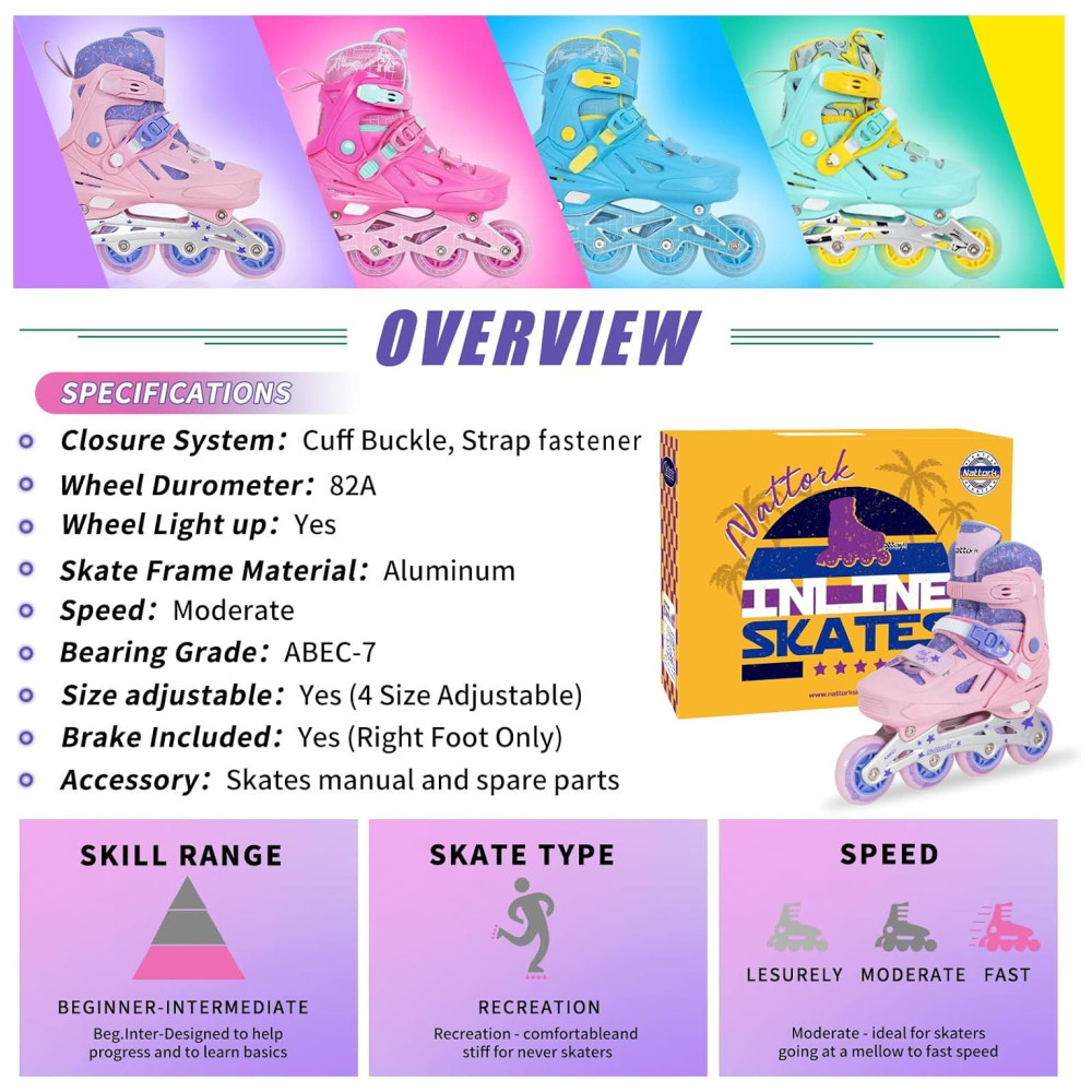 Rodas Iluminadas: Os patins em linha são equipados com 8 rodas iluminadas, todas acendendo e proporcionando uma exibição colorida do arco íris quando seu filho começa a andar de skate. As luzes são alimentadas pelas rodas em movimento e nunca precisam de substituição de baterias Dicas: verifique e aperte as rodas regularmente para evitar que caiam