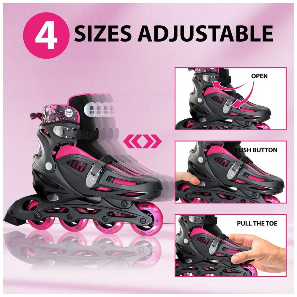 Deslize com Estilo em Qualquer Idade: Explore a emoção da patinação com os nossos incríveis patins em linha ajustáveis. Com quatro opções de tamanho facilmente ajustáveis, eles são perfeitos tanto para crianças quanto para adultos.