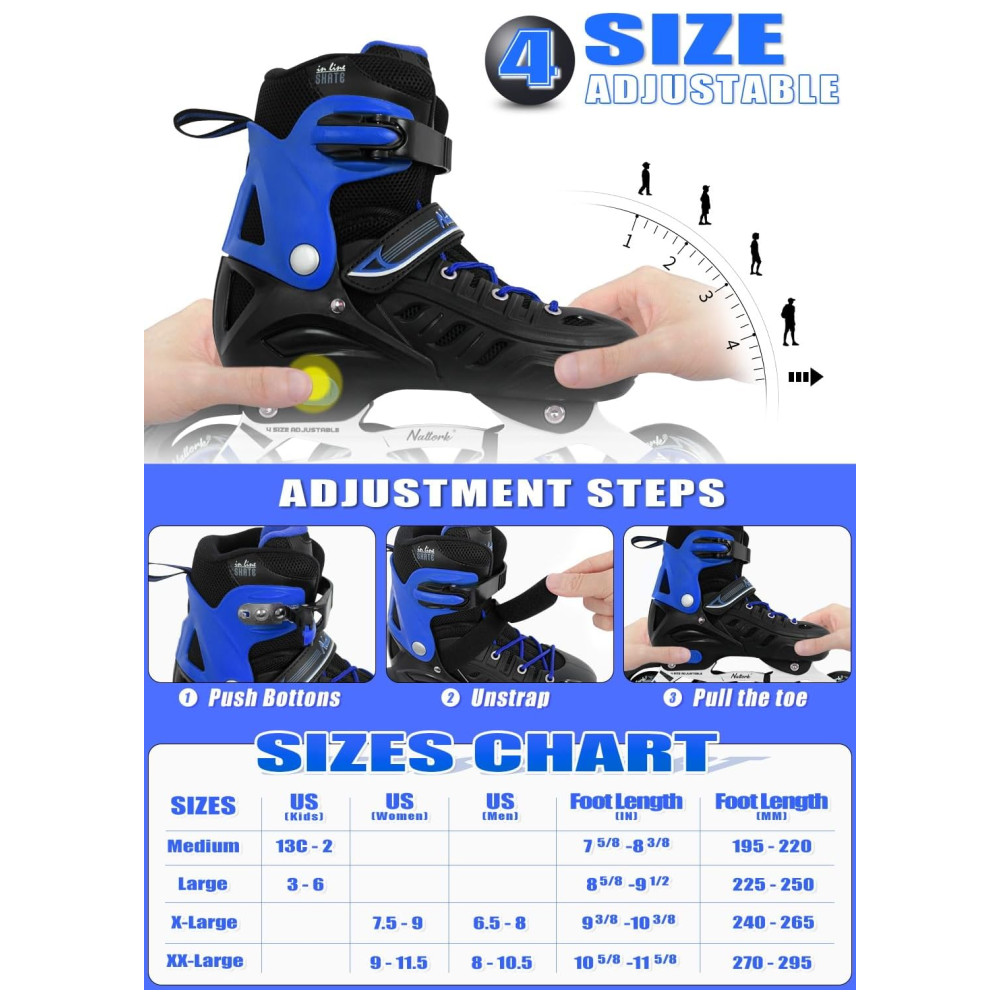 Ajuste ajustável: Esses patins vêm com um sistema de dimensionamento ajustável, permitindo que você encontre o ajuste perfeito para seus pés. O invólucro de plástico pode ser facilmente ajustado para acomodar diferentes tamanhos de pés, garantindo um ajuste confortável e . Esse recurso é particularmente útil para crianças em crescimento ou indivíduos com larguras variadas de pés.