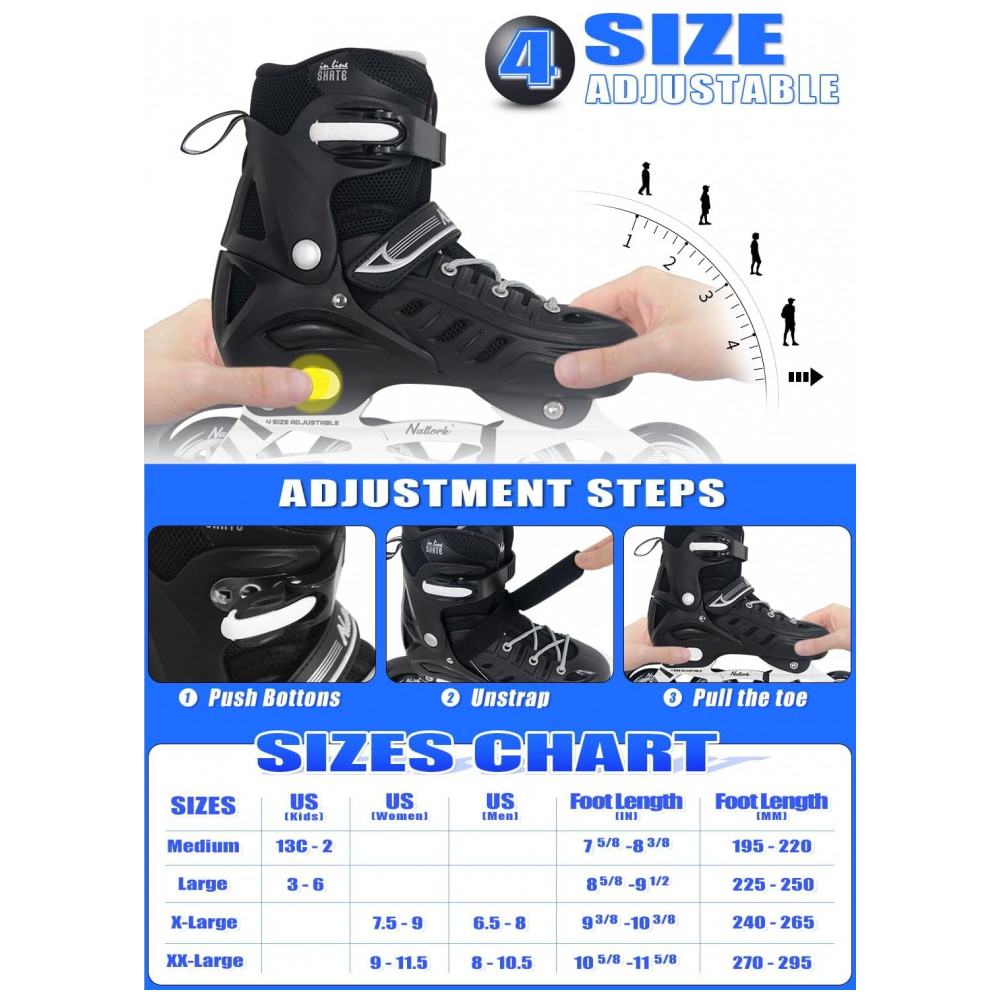 Ajuste ajustável: Esses patins vêm com um sistema de dimensionamento ajustável, permitindo que você encontre o ajuste perfeito para seus pés. O invólucro de plástico pode ser facilmente ajustado para acomodar diferentes tamanhos de pés, garantindo um ajuste confortável e . Esse recurso é particularmente útil para crianças em crescimento ou indivíduos com larguras variadas de pés.