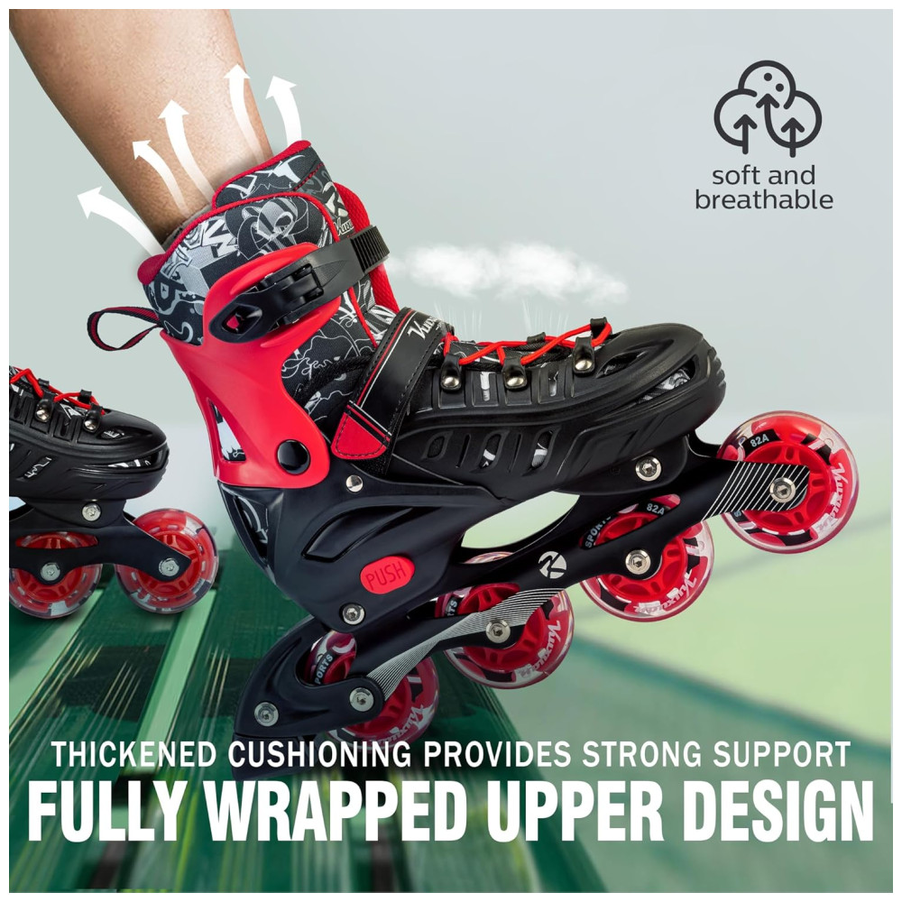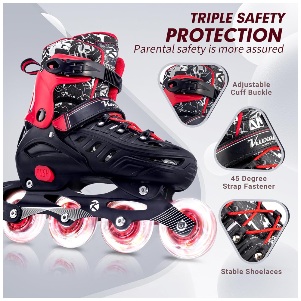 Conforto e Segurança: A estrutura do patins foi projetada para proporcionar conforto máximo e garantir a segurança da criança, evitando possíveis torções nos tornozelos e pés.