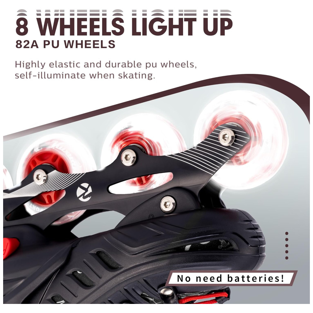 ALTO DESEMPENHO: A estrutura do skate inline é fabricada com liga de alumínio reforçada. As rodas de poliuretano 82A de alto rebote e os rolamentos ABEC 7 de alta velocidade oferecem um desempenho excepcional. O revestimento interno macio e respirável protege os tornozelos, enquanto as medidas de proteção tripla proporcionam uma sensação de conforto adicional ao patinar.