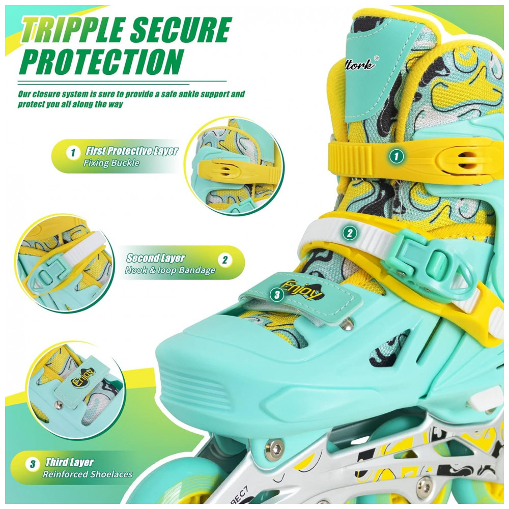 Proteção Tripla Segura: A fivela de catraca de segurança, a alça de força e o sistema de fechamento com cadarços ajudam a fixar os pés corretamente no skate, criando um efeito de envolvimento adicional ao usar nossos patins infantis em linha. Os freios atualizados equipados nos patins ajudam a frear quando necessário e também auxiliam na prevenção de colisões com outros patinadores.