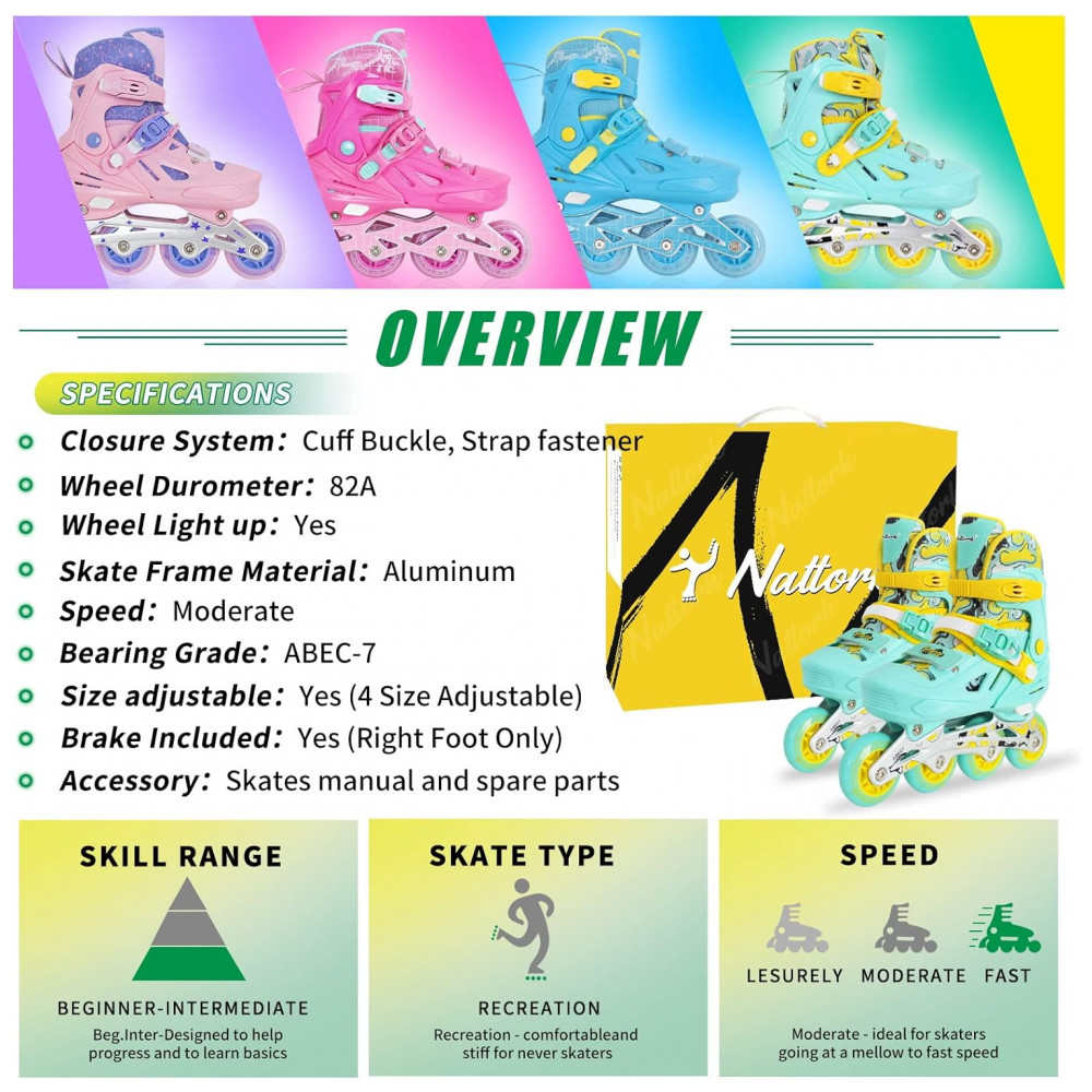 Rodas Iluminadas: Os patins em linha são equipados com 8 rodas iluminadas, todas acendendo e proporcionando uma exibição colorida do arco íris quando seu filho começa a andar de skate. As luzes são alimentadas pelas rodas em movimento e nunca precisam de substituição de baterias Dicas: verifique e aperte as rodas regularmente para evitar que caiam