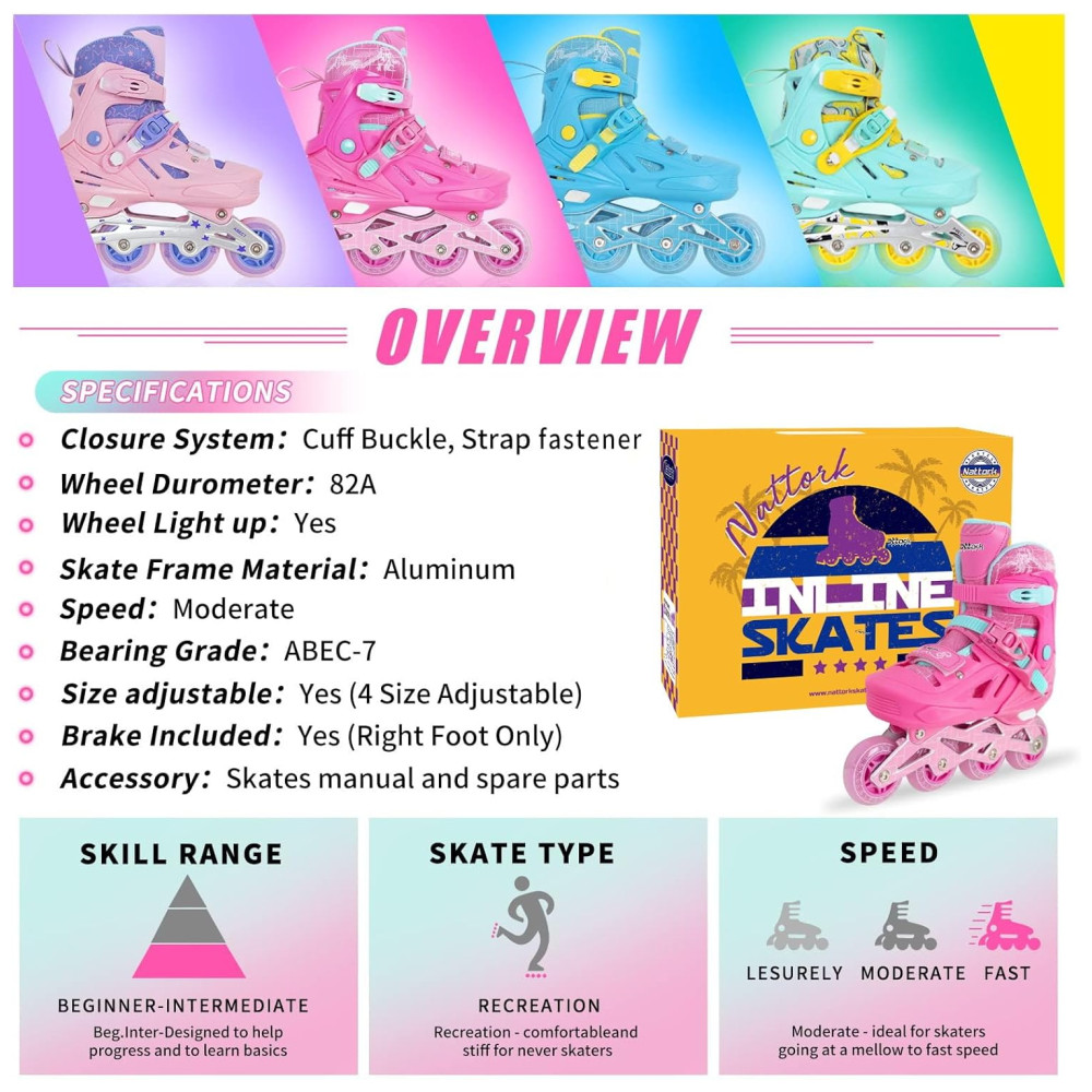 Rodas Iluminadas: Os patins em linha são equipados com 8 rodas iluminadas, todas acendendo e proporcionando uma exibição colorida do arco íris quando seu filho começa a andar de skate. As luzes são alimentadas pelas rodas em movimento e nunca precisam de substituição de baterias Dicas: verifique e aperte as rodas regularmente para evitar que caiam