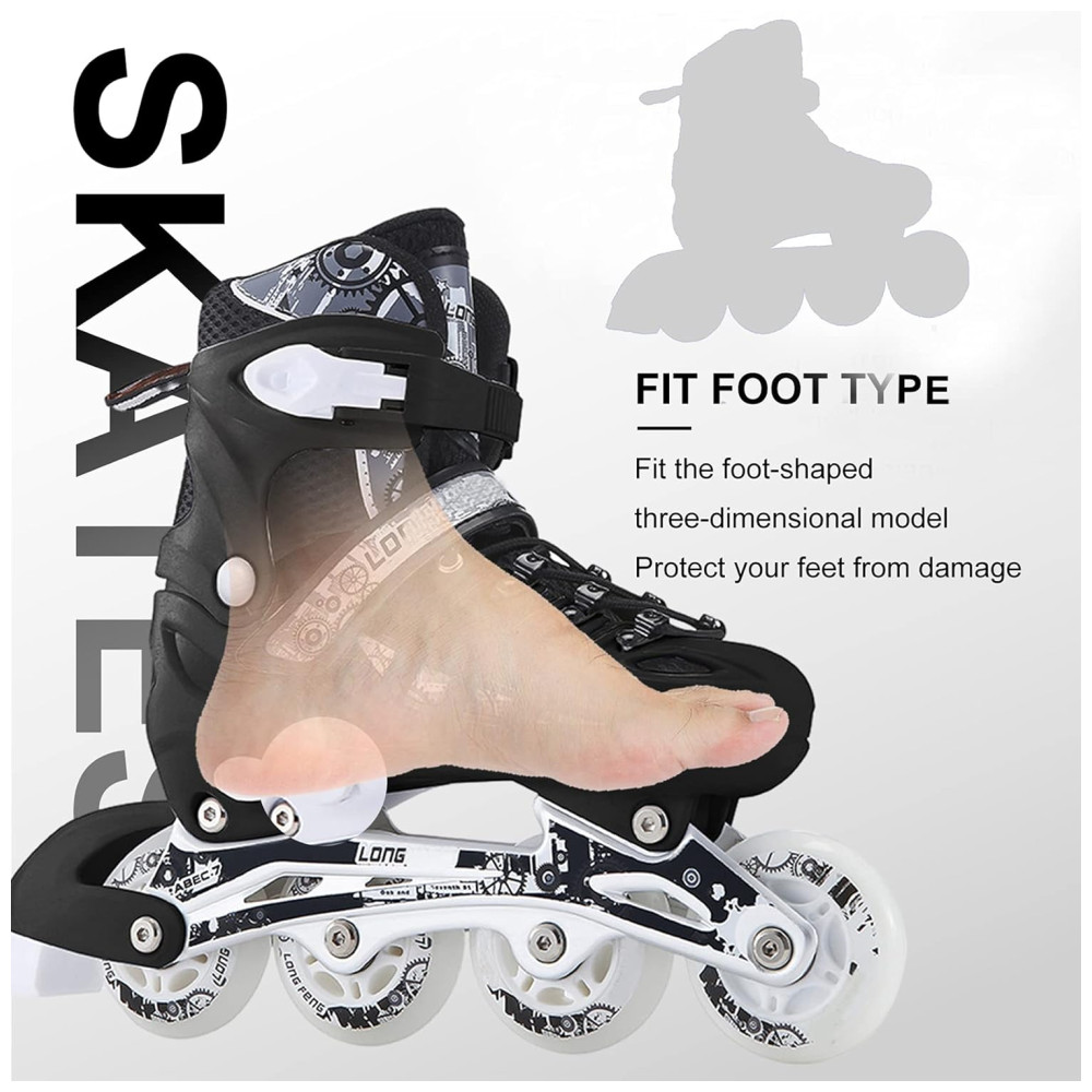 Tamanho Ajustável: Cada patins possui um botão de ajuste de comprimento. Ao pressionar o botão de tamanho, é possível ajustar facilmente o comprimento, proporcionando conveniência mesmo à medida que os pés crescem. Assim, crianças e jovens poderão usufruir dos patins por muitos anos.