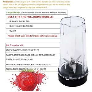 O PACOTE INCLUI: 1 * Lâmina Individual (6 Aletas), 2 * Copos Individuais de 473 ml com Tampa. Peças de reposição do liquidificador compatíveis com Ninja BL770, BL771, BL772, BL773CO, BL780, BL660, BL740. Não serve para copos de 532 ml, 710 ml, 946 ml.
