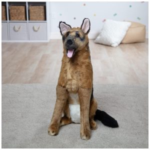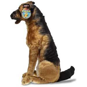 Este cachorro de pelúcia é um pastor alemão com a cabeça inclinada, feito de tecido macio e peludo com atenção aos detalhes. É construído resistente e possui uma estrutura interna que o mantém em pé. Não é destinado a ser usado como assento ou passeio.