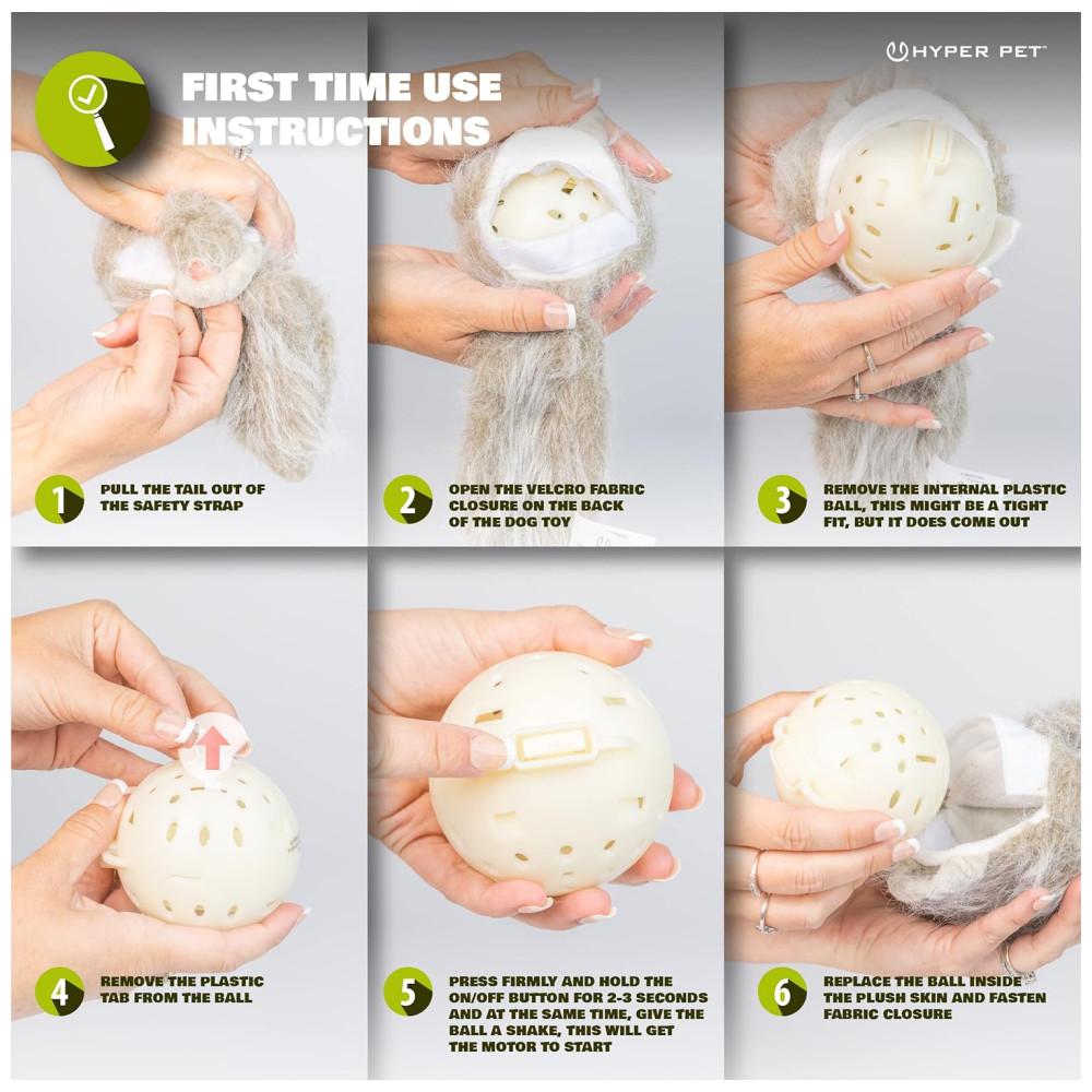 JOGO OPERADO POR BATERIA Para trocar as baterias, remova a bola de plástico da tampa de pelúcia. Use a guia para abrir a bola. Remova o compartimento da bateria para inserir 3 baterias AAA. Este brinquedo para cão irá parar após um período sem uso. As baterias estão incluídas