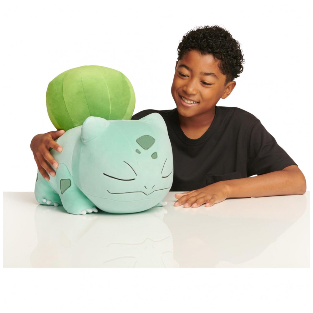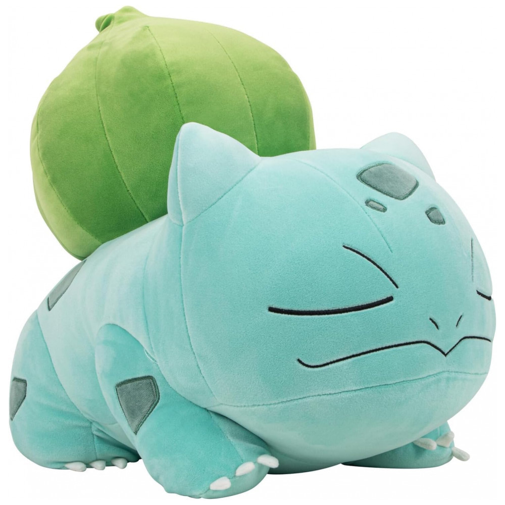 A pelúcia Pokémon Bulbasaur Sleeping Jazwares é um modelo de grande porte em posição deitada, com aproximadamente 55 cm de comprimento, representando o personagem Bulbasaur em postura de sono. Produzida em tecido poliéster macio com enchimento sintético, forma um volume baixo e alongado adequado para apoio em camas, sofás ou superfícies planas.