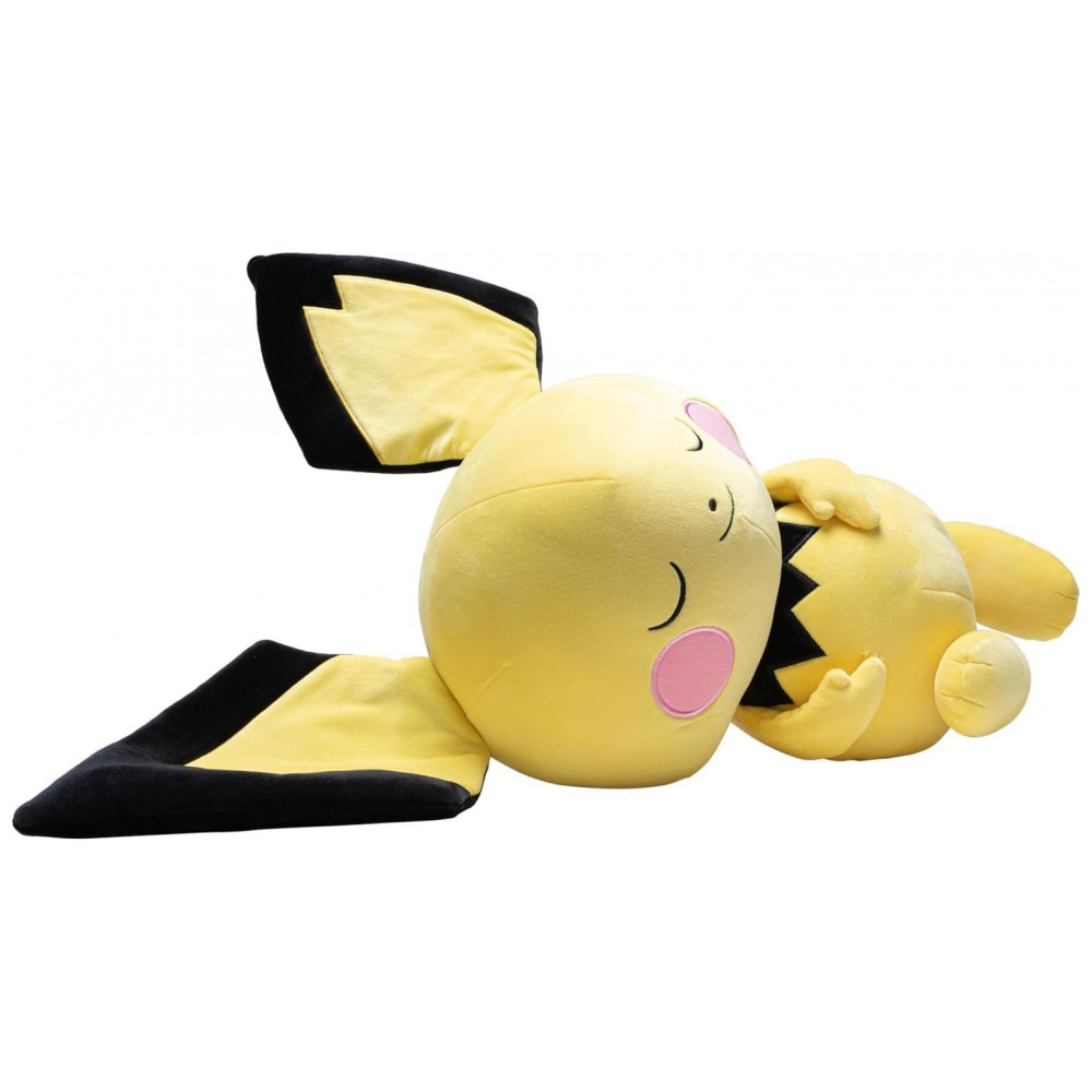 Pelúcia Pokémon Pichu Jazwares amarela deitada para dormir tamanho 46cm