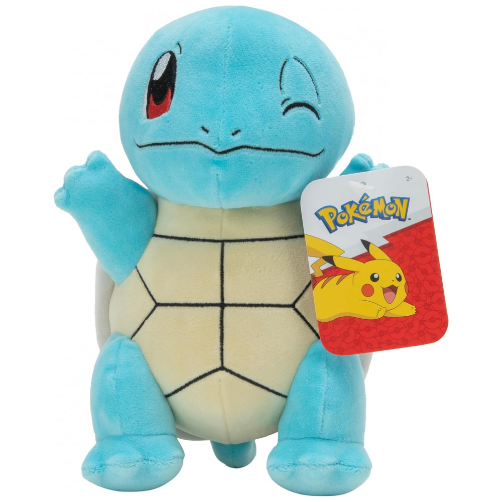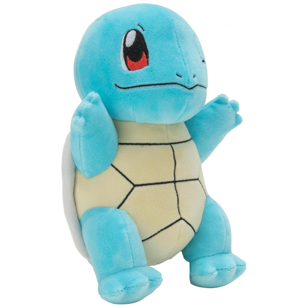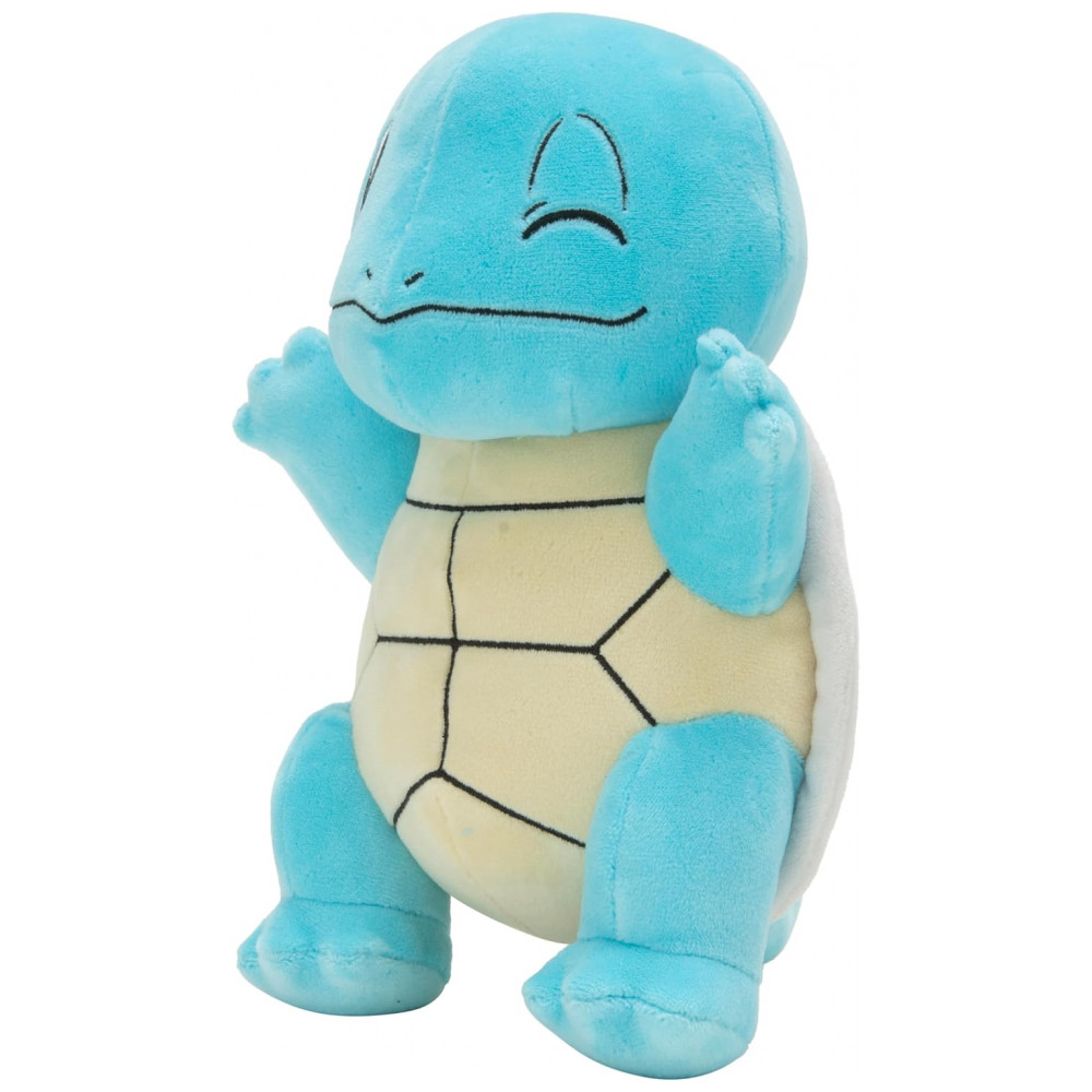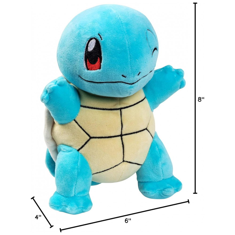 A pelúcia Pokémon Squirtle de aproximadamente 20 cm é um boneco macio produzido em poliéster, desenvolvido para representar o Pokémon Squirtle em formato tridimensional. O modelo reproduz o visual do personagem da série animada, com corpo azul, casco marrom, barriga clara e cabeça proporcional ao design oficial.