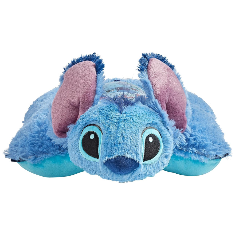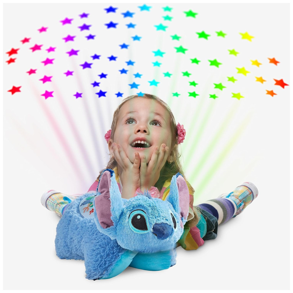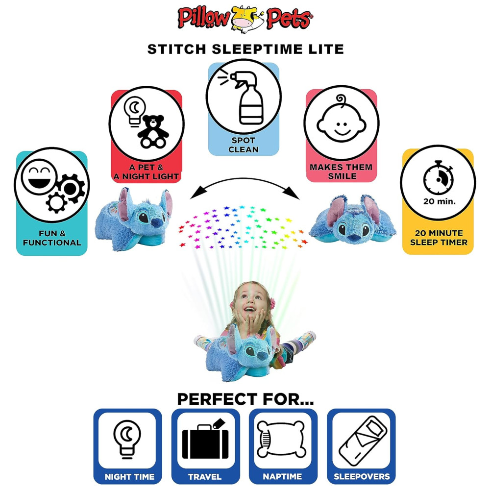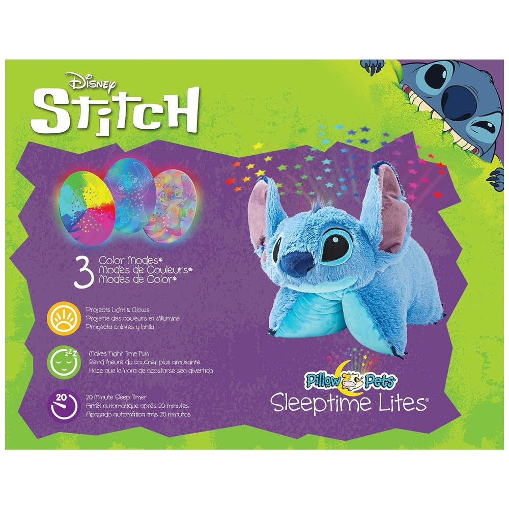 O Pillow Pets e Disney apresentam o adorável personagem Stitch do filme de sucesso Lilo Stitch em um Sleeptime Lite que projeta estrelas coloridas do arco íris no teto do quarto. Este companheiro perfeito começa como um amigo divertido para brincar e depois se torna uma luz noturna relaxante. O Sleeptime Lite projeta três modos de luz diferentes com as cores do arco íris que podem ser configurados para mudar lenta ou rapidamente.