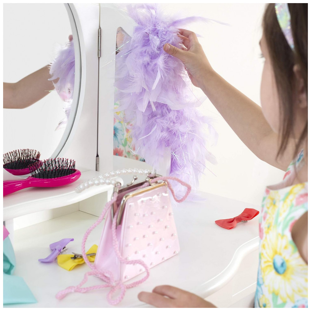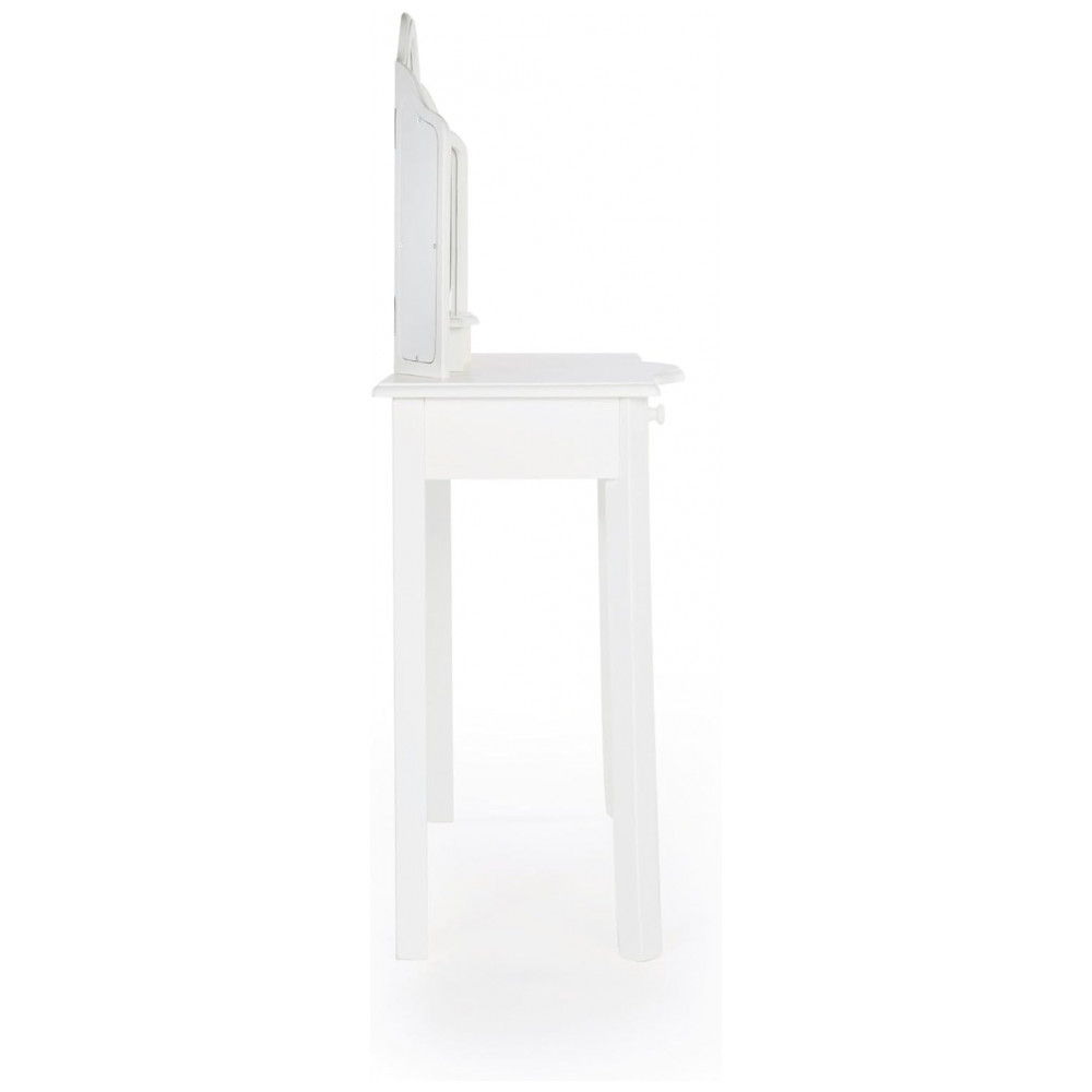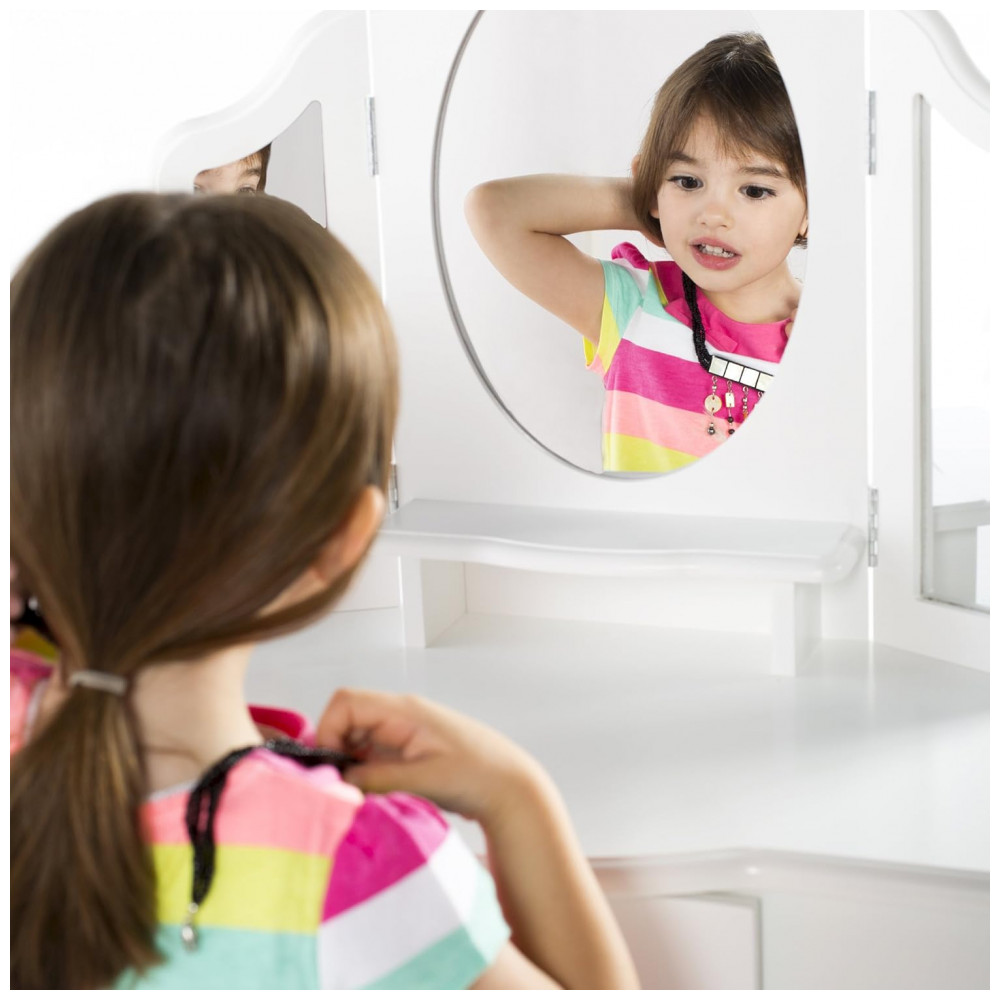 A Guidecraft Classic White Vanity and Stool Set é uma penteadeira infantil em madeira na cor branca, composta por mesa com tampo estreito, espelho triplo e banqueta coordenada, indicada para crianças a partir de 3 anos. A estrutura combina madeira maciça e madeira engenheirada com acabamento UV em branco fosco, formando um conjunto resistente para uso em quartos infantis e brinquedotecas.
