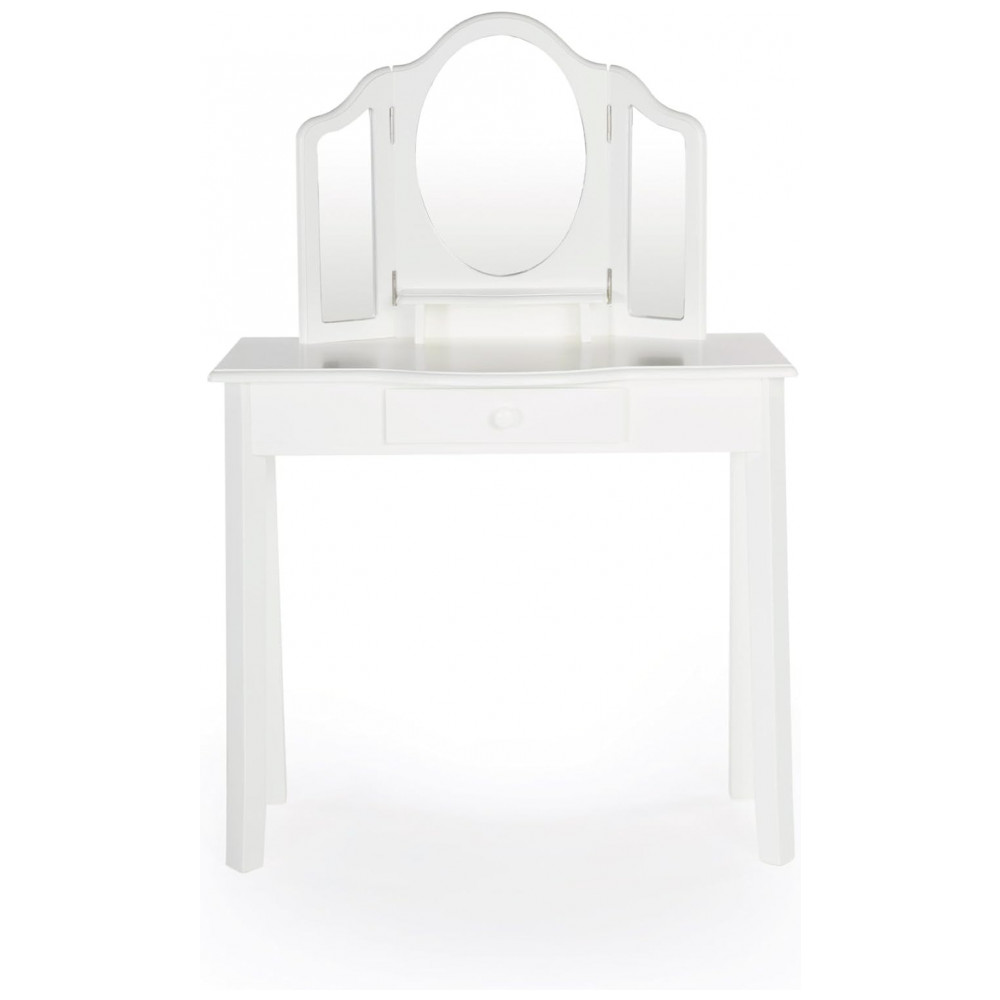 A parte superior reúne um espelho central e dois espelhos laterais articulados em acrílico resistente a estilhaços, com contornos levemente ondulados. A mesa inclui uma gaveta central com puxador para guardar acessórios, além de espaço de apoio para escovas, bijuterias e pequenos objetos de uso infantil.