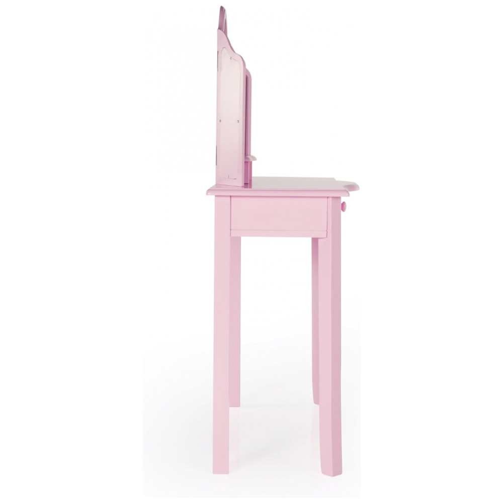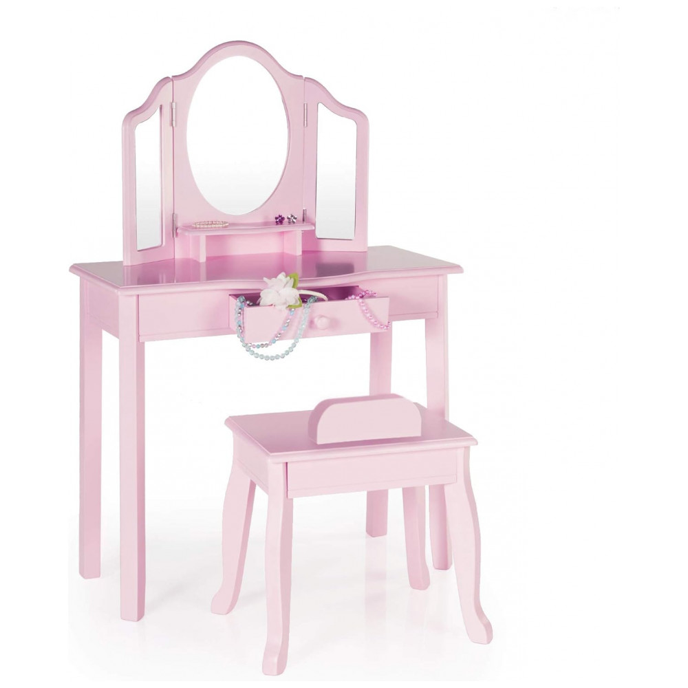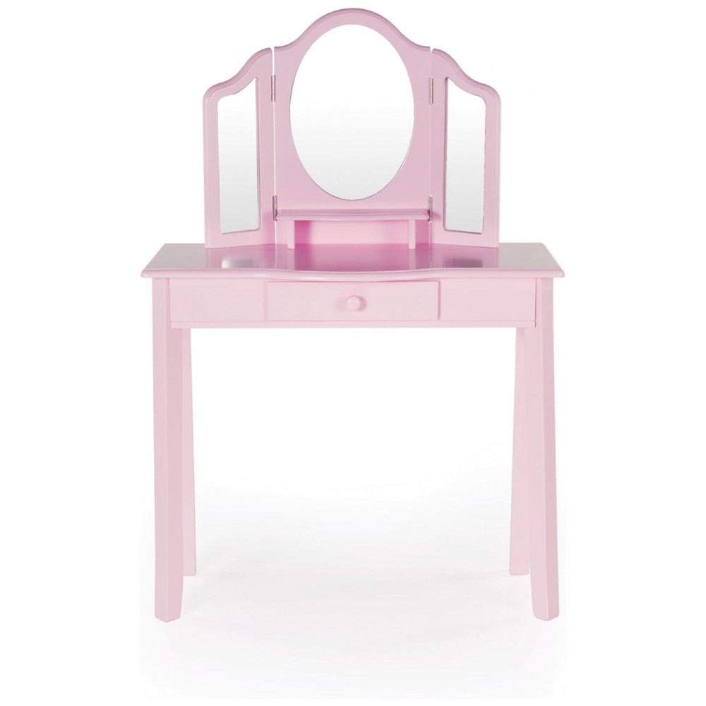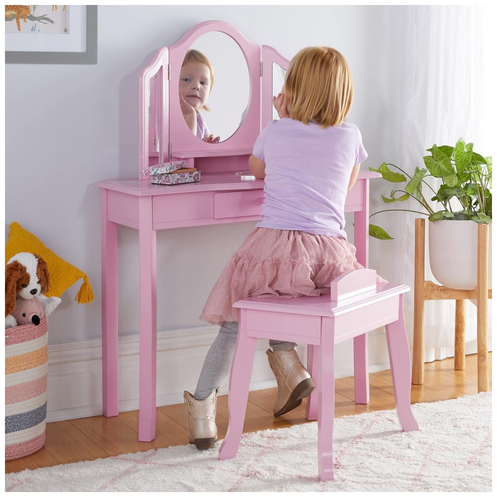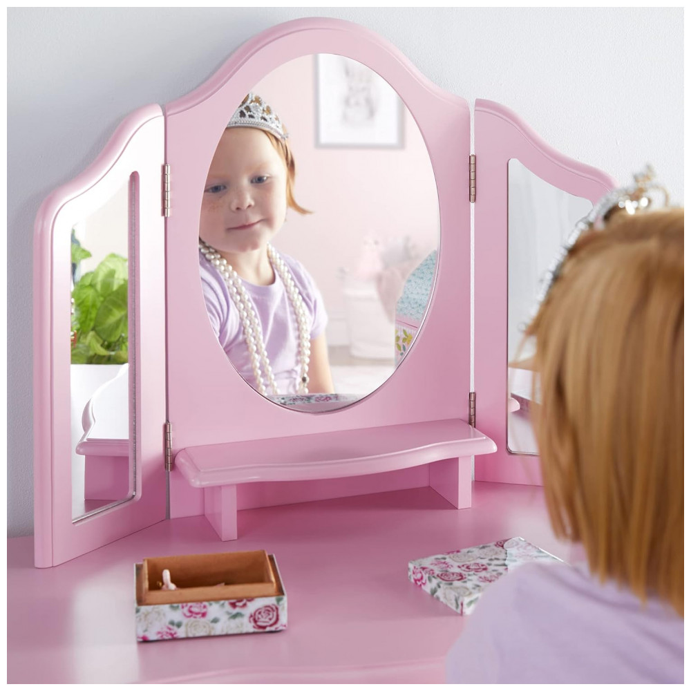 Penteadeira infantil Guidecraft rosa com espelho triplo e banquinho em madeira para brincadeiras de faz de conta