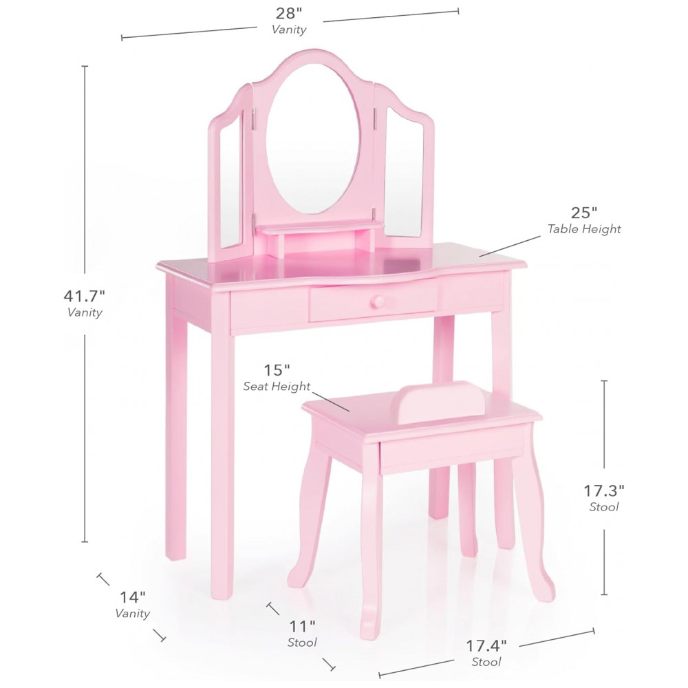 A penteadeira infantil Guidecraft Pink Vanity and Stool Set foi desenvolvida para compor um cantinho de vestir, maquiagem de faz de conta e organização de acessórios em quartos infantis. O conjunto inclui mesa com tampo retangular, gaveta central com puxador e espelho triplo em acrílico resistente a estilhaços, com moldura e laterais suavemente recortadas para compor o visual de penteadeira clássica em escala infantil.