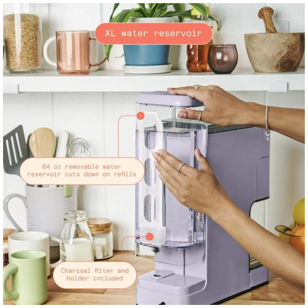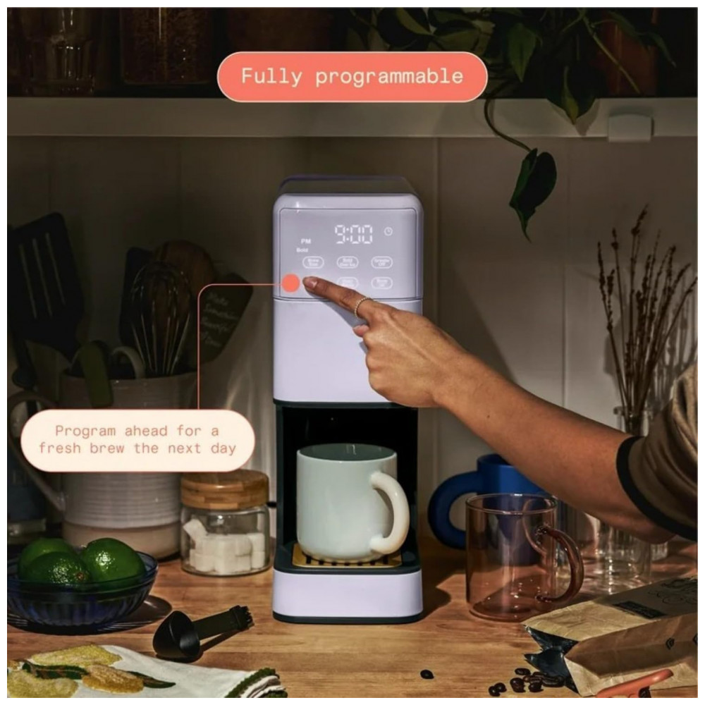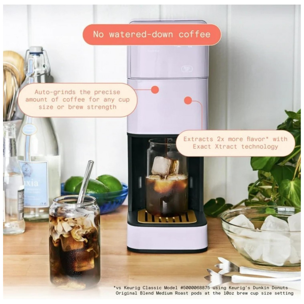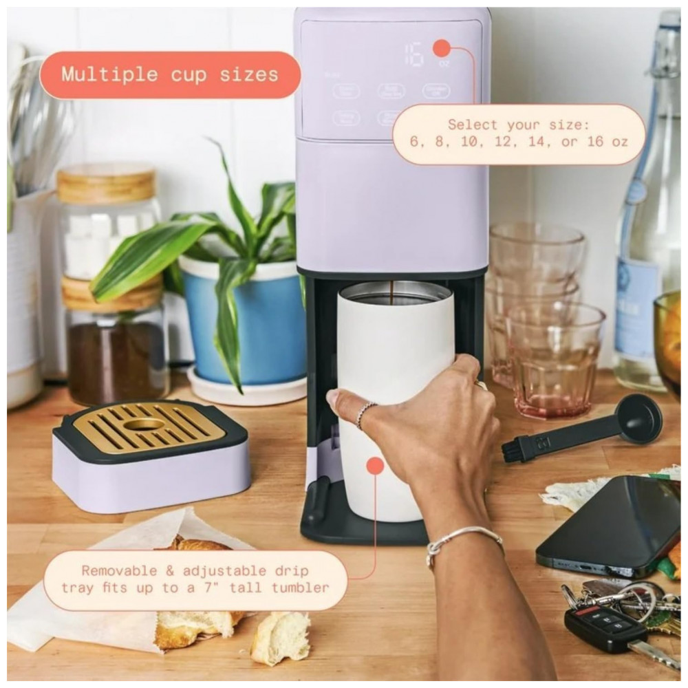 A Perfect Grind Lavender é uma máquina de café drip single serve equipada com moedor burr integrado para processar grãos inteiros em preparos individuais de 177 a 473 ml (6-16 oz), com seleções de força regular, bold ou over ice e reservatório removível de 1,89 L adequado para uso diário múltiplo.