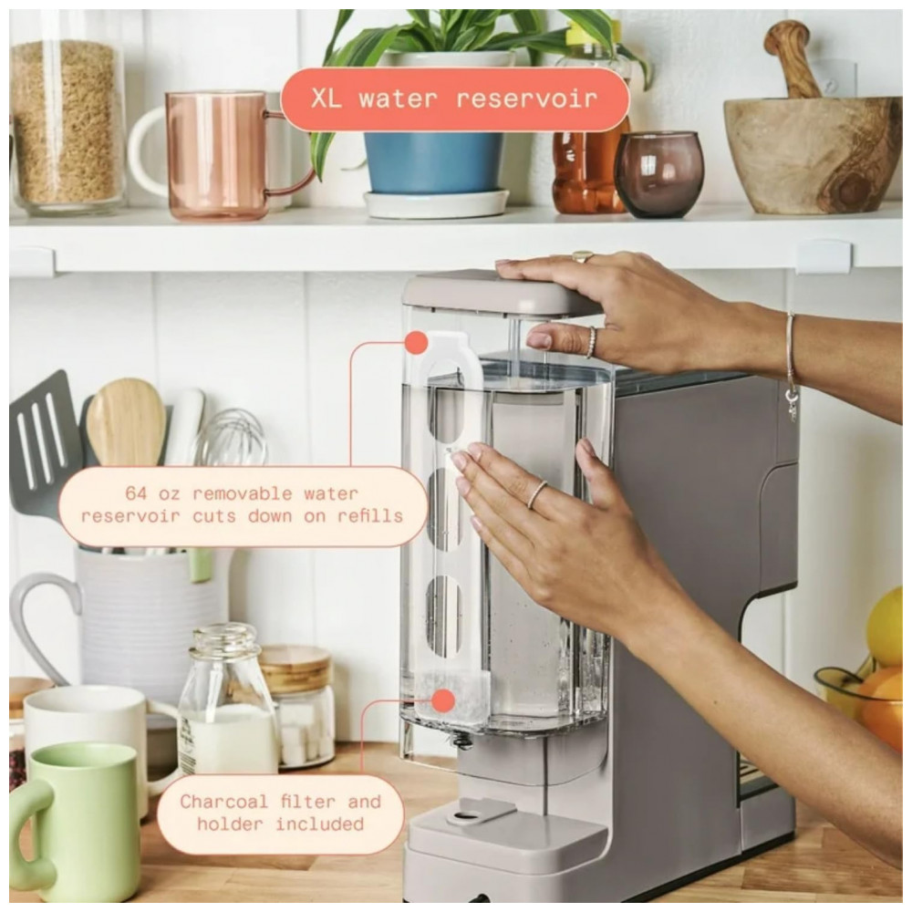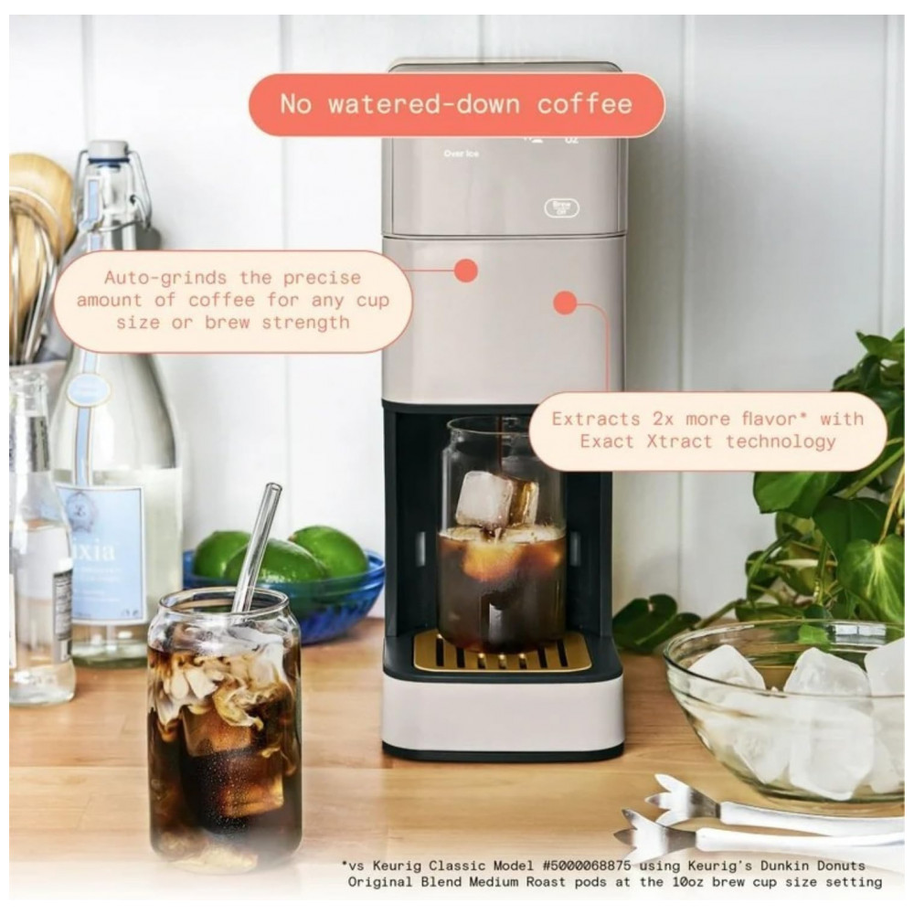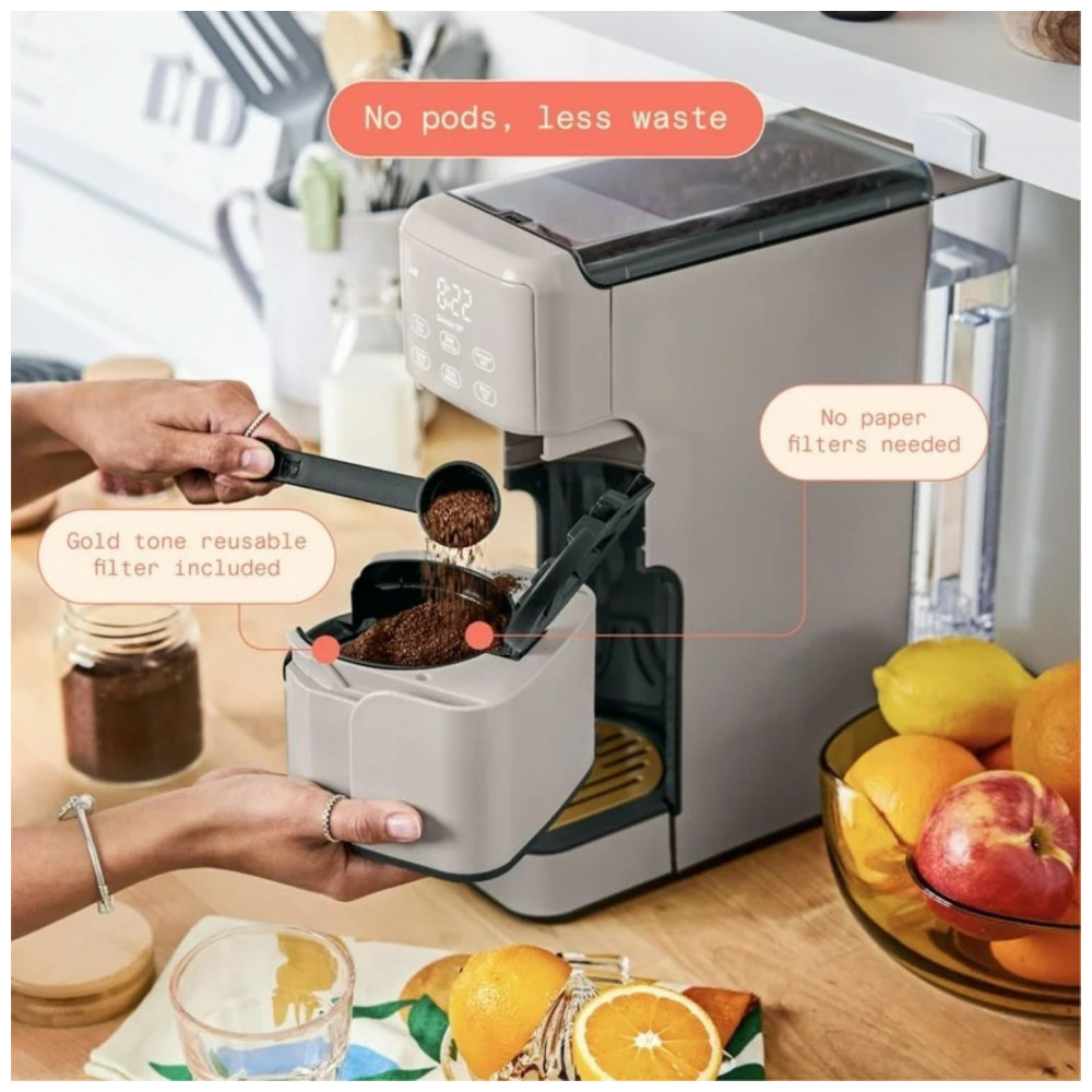 A Perfect Grind Porcini Taupe é uma máquina de café drip single serve com moedor burr integrado para preparos de 177 a 473 ml (6-16 oz) usando grãos inteiros ou pó pré-moído, oferecendo configurações de força regular, bold ou over ice e reservatório removível de 1,89 L para múltiplos ciclos diários.