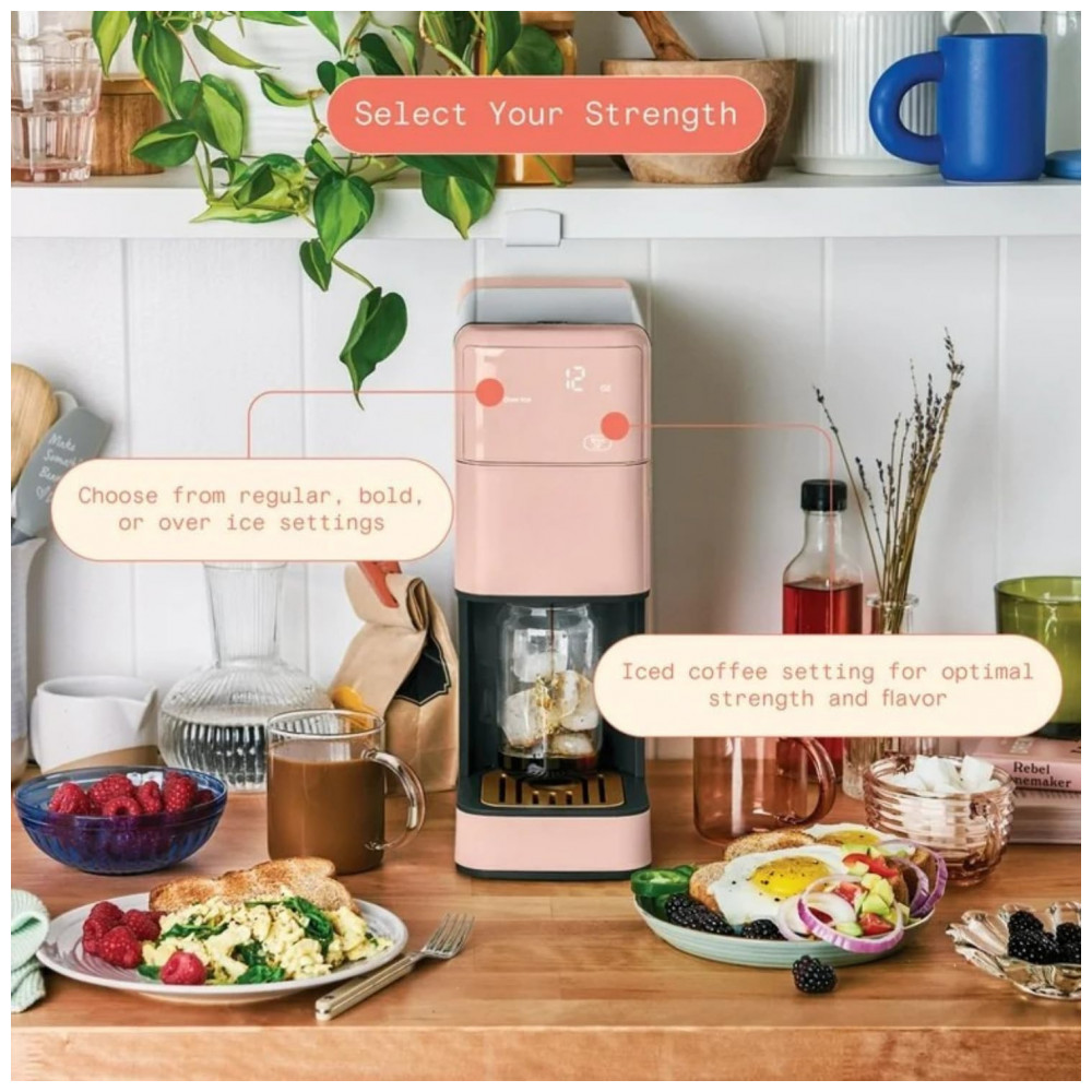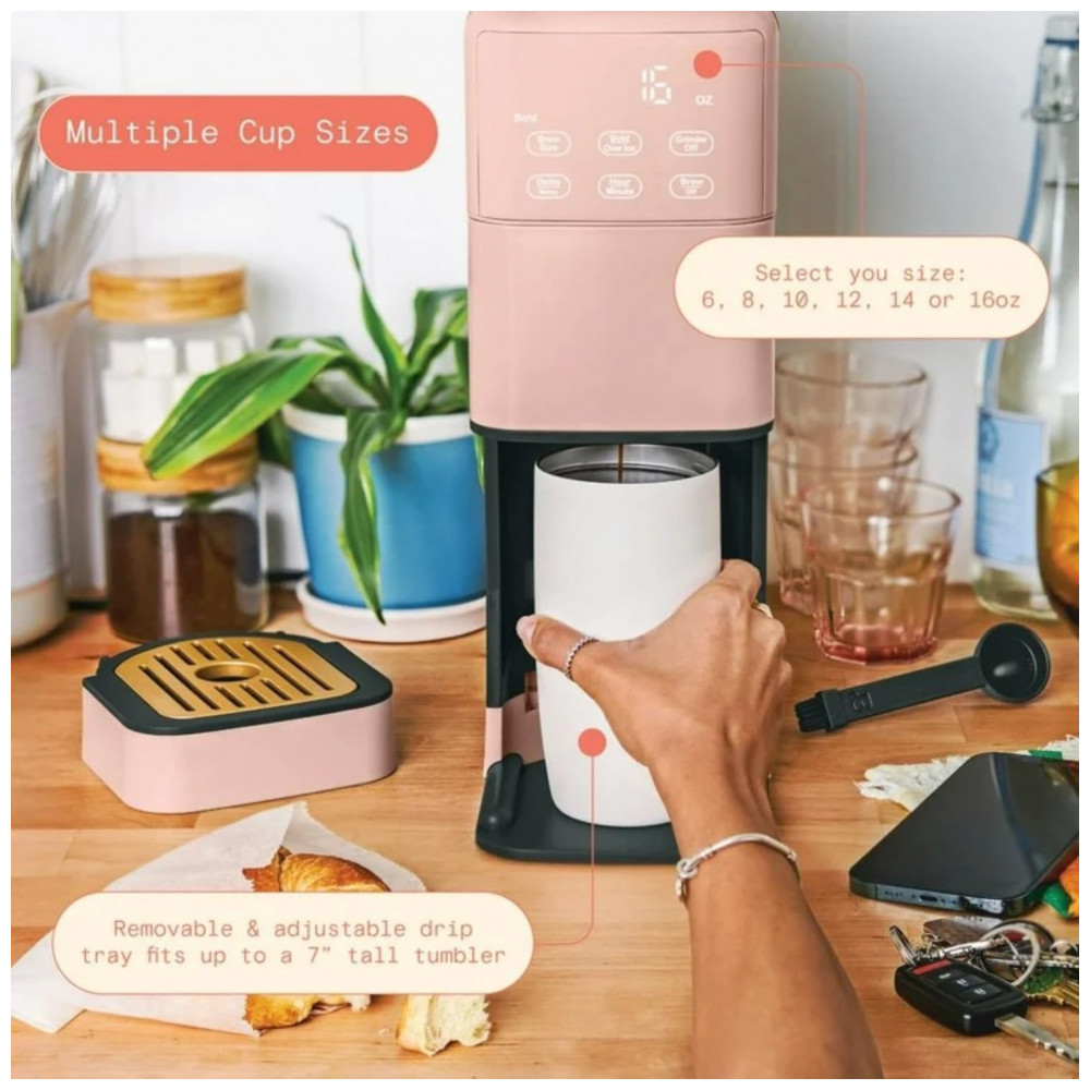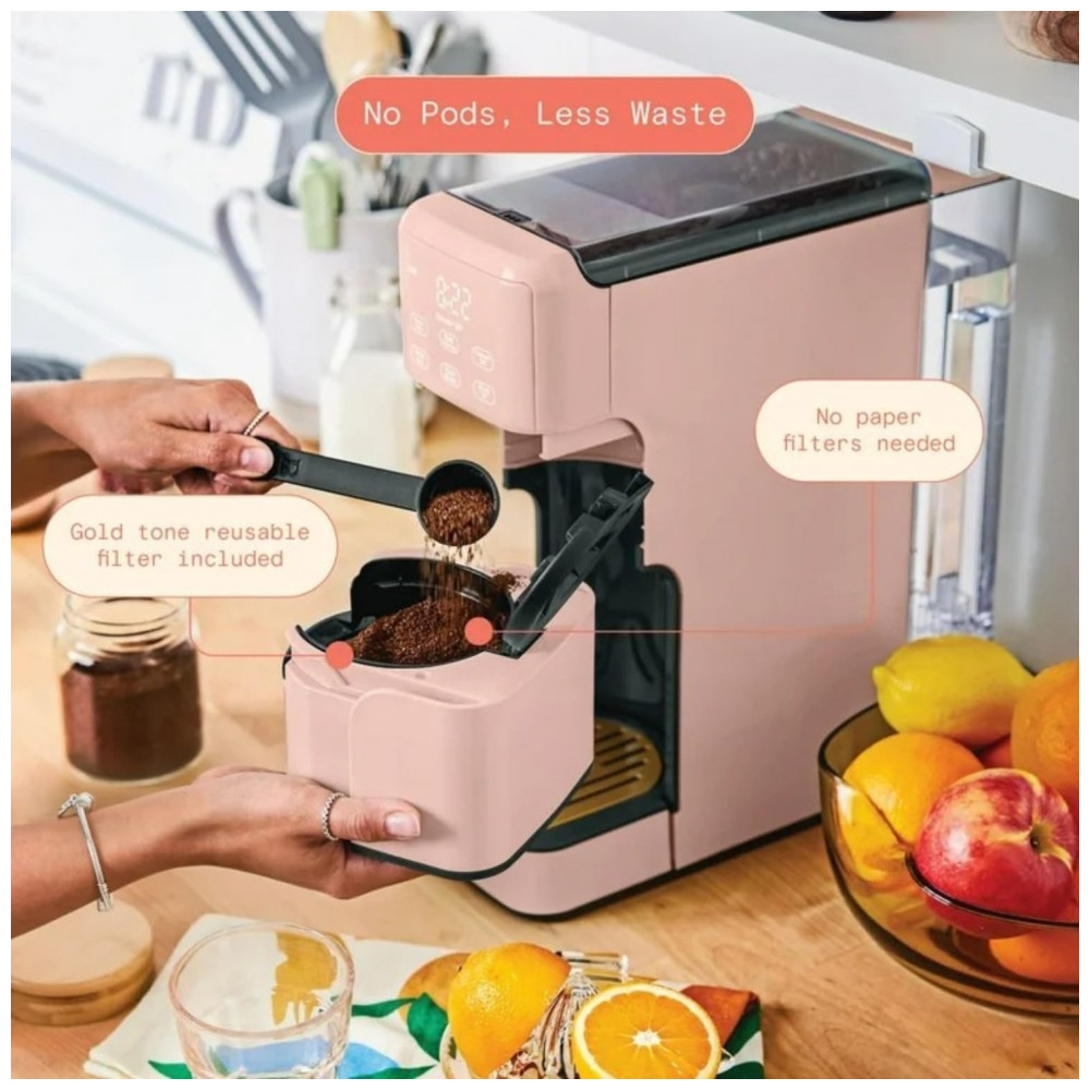 A Perfect Grind Rose é uma máquina de café drip single serve com moedor burr integrado que processa grãos inteiros para preparos de 177 a 473 ml (6-16 oz), com opções de força regular, bold ou over ice, e reservatório removível de 1,89 L para múltiplos preparos diários. Suporta café quente ou gelado via display touch programável com timer para auto-brew matinal, eliminando necessidade de pods descartáveis.