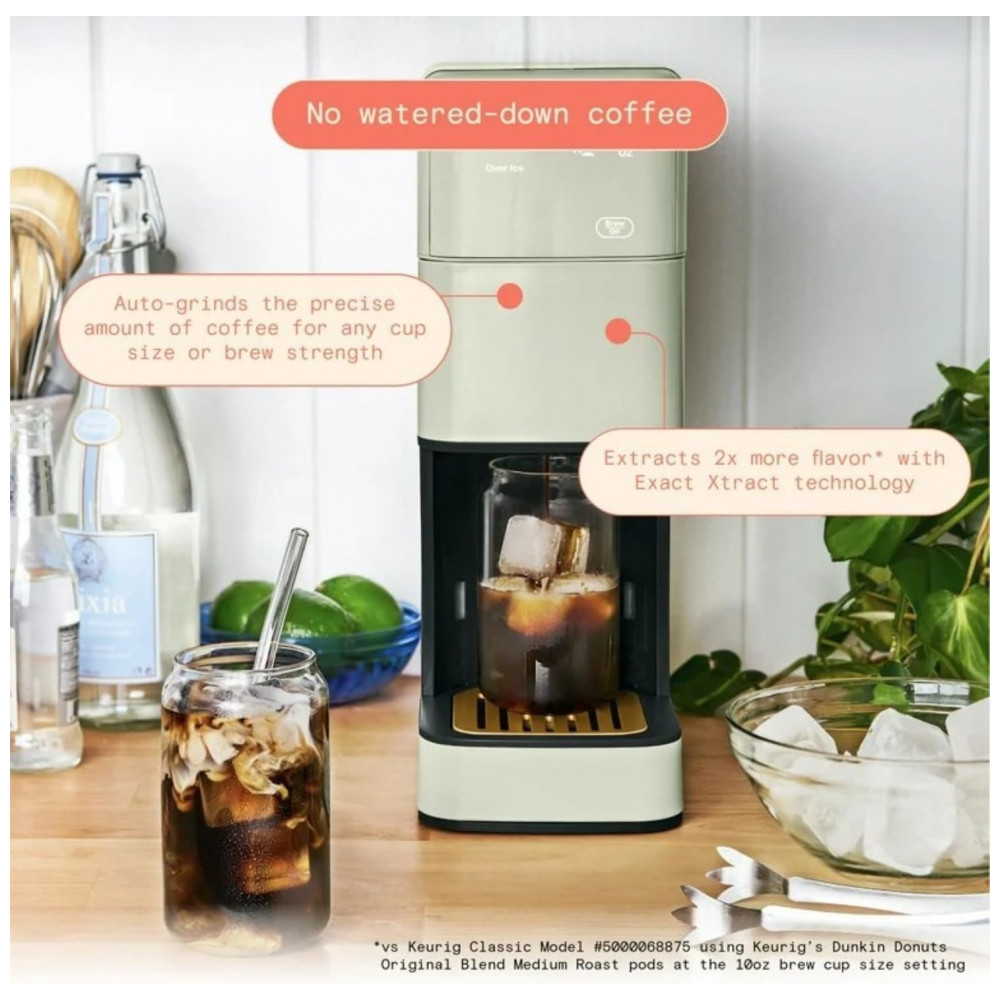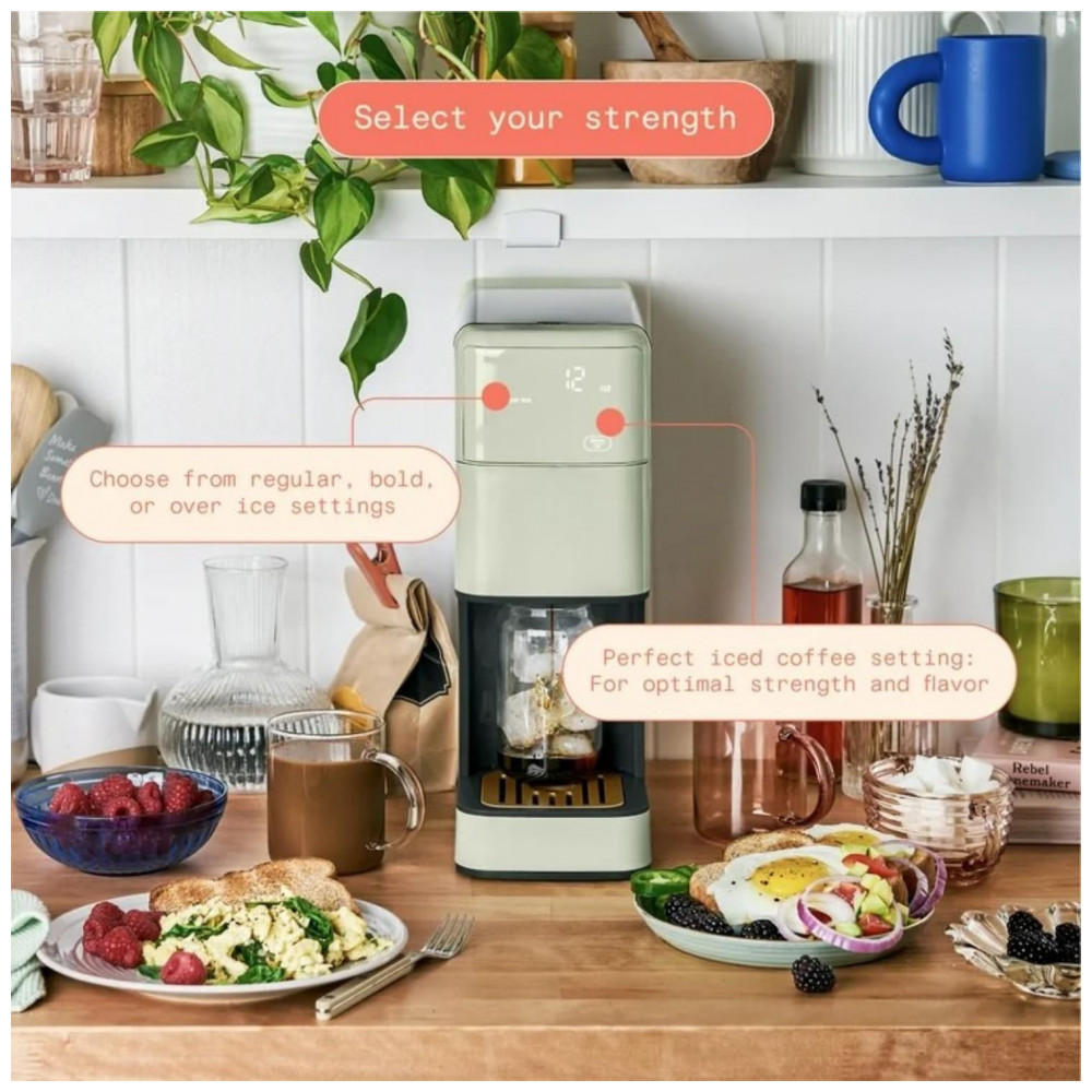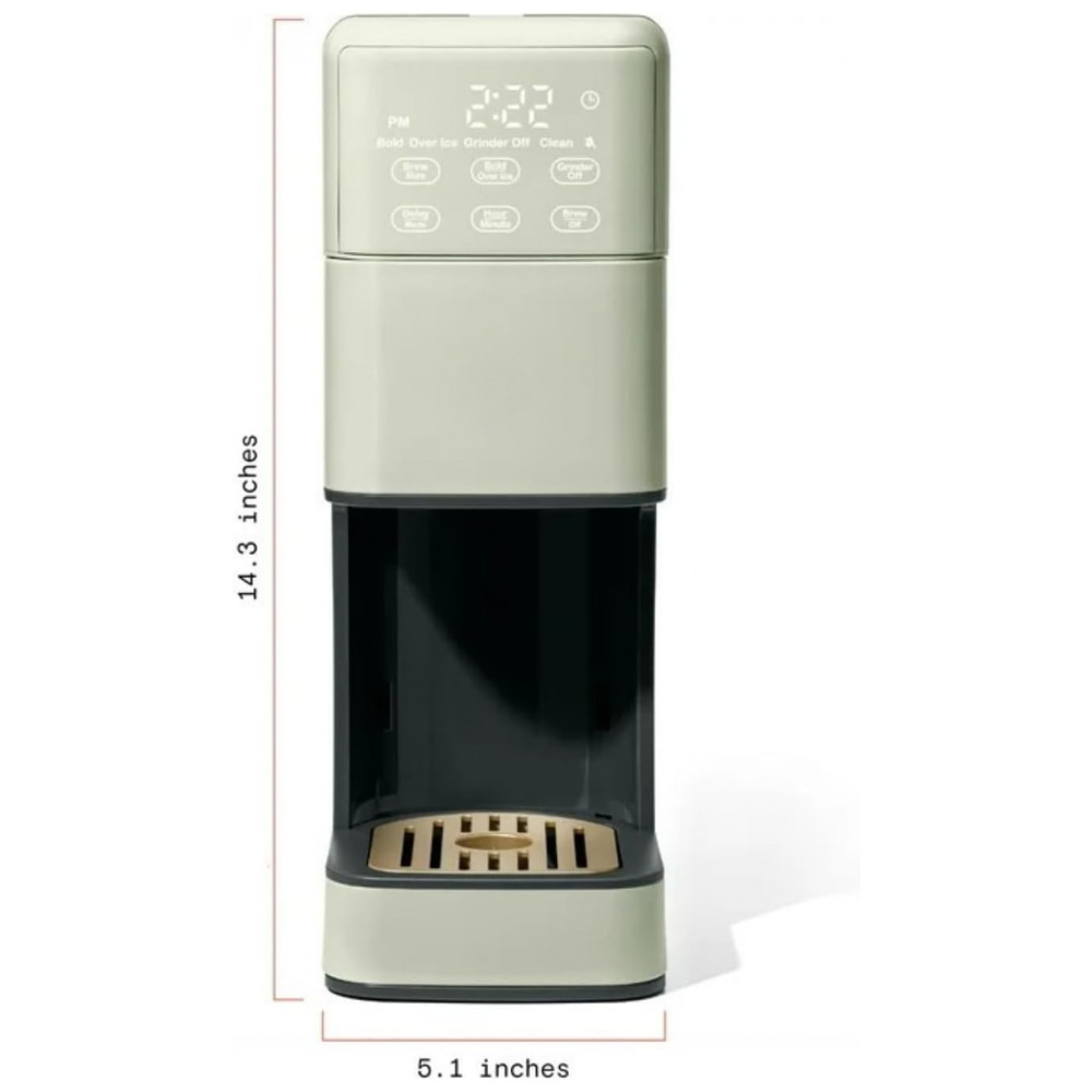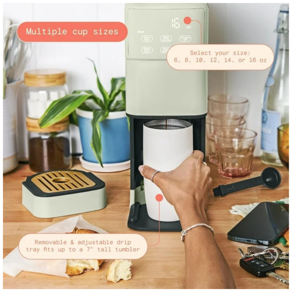 A Perfect Grind Sage Green é uma máquina de café drip single serve com moedor burr integrado para grãos inteiros ou pó pré-moído, oferecendo tamanhos de 177-473 ml (6-16 oz) e configurações de força regular, bold ou over ice, com reservatório removível de 1,89 L para múltiplos preparos diários. Suporta café quente ou gelado, com display touch programável para timer e auto-brew matinal, sem uso de pods descartáveis.