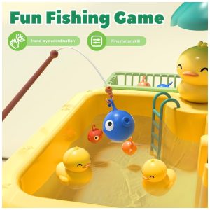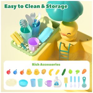 O conjunto de brinquedos de pia 2 em 1 inclui acessórios de brinquedos flutuantes coloridos, permitindo que seus filhos aproveitem o jogo de cozinha enquanto simulam como é a pesca real para desenvolver sua coordenação olho mão. Os brinquedos de pesca e patos de brinquedo também podem ser usados como brinquedos de banho e piscina. Os brinquedos de dramatização de cozinha incluem copo de plástico, prato de plástico, escova, detergente para brincar, conjunto de garfo e faca de plástico e brinquedos de comida para as crianças brincarem.