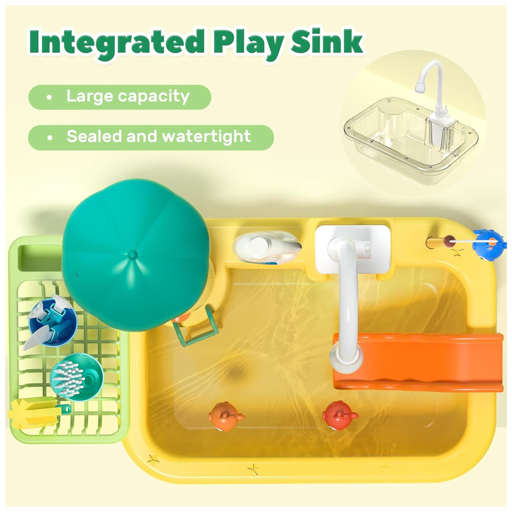 Este conjunto de pia de brincar com água corrente é perfeito para crianças que adoram brincar de cozinha e pesca. A torneira elétrica à prova d água permite que seus filhos lavem seus brinquedos de comida, copos e pratos com água corrente enquanto se divertem na cozinha. O conjunto é feito de material plástico ABS de qualidade, inodoro e não tóxico, sem BPA, proporcionando um espaço de brincar seguro e amplo para as crianças.