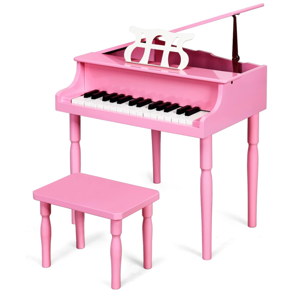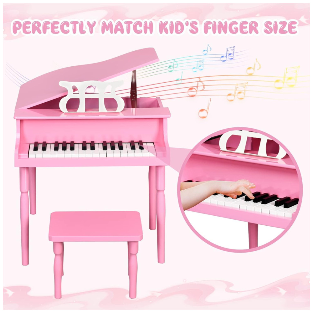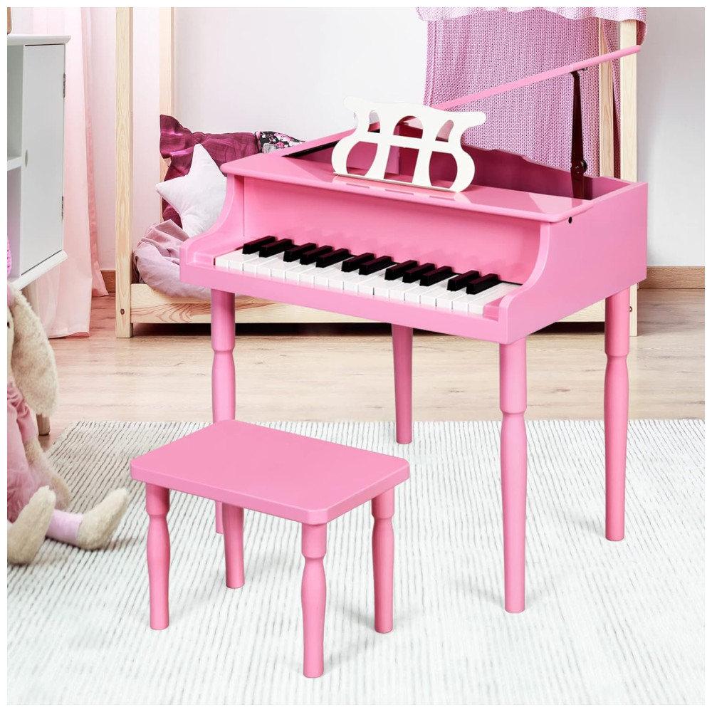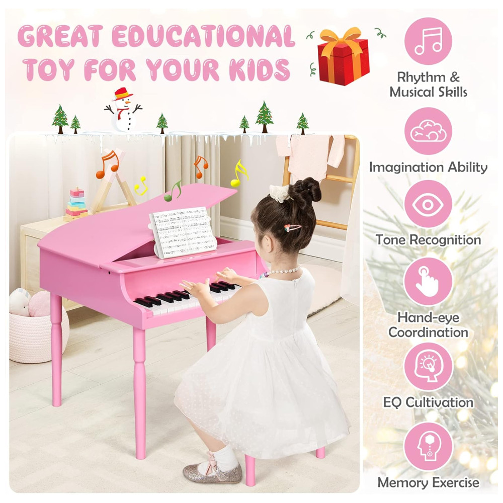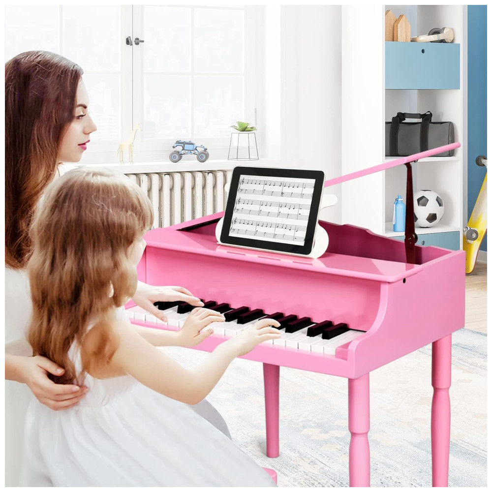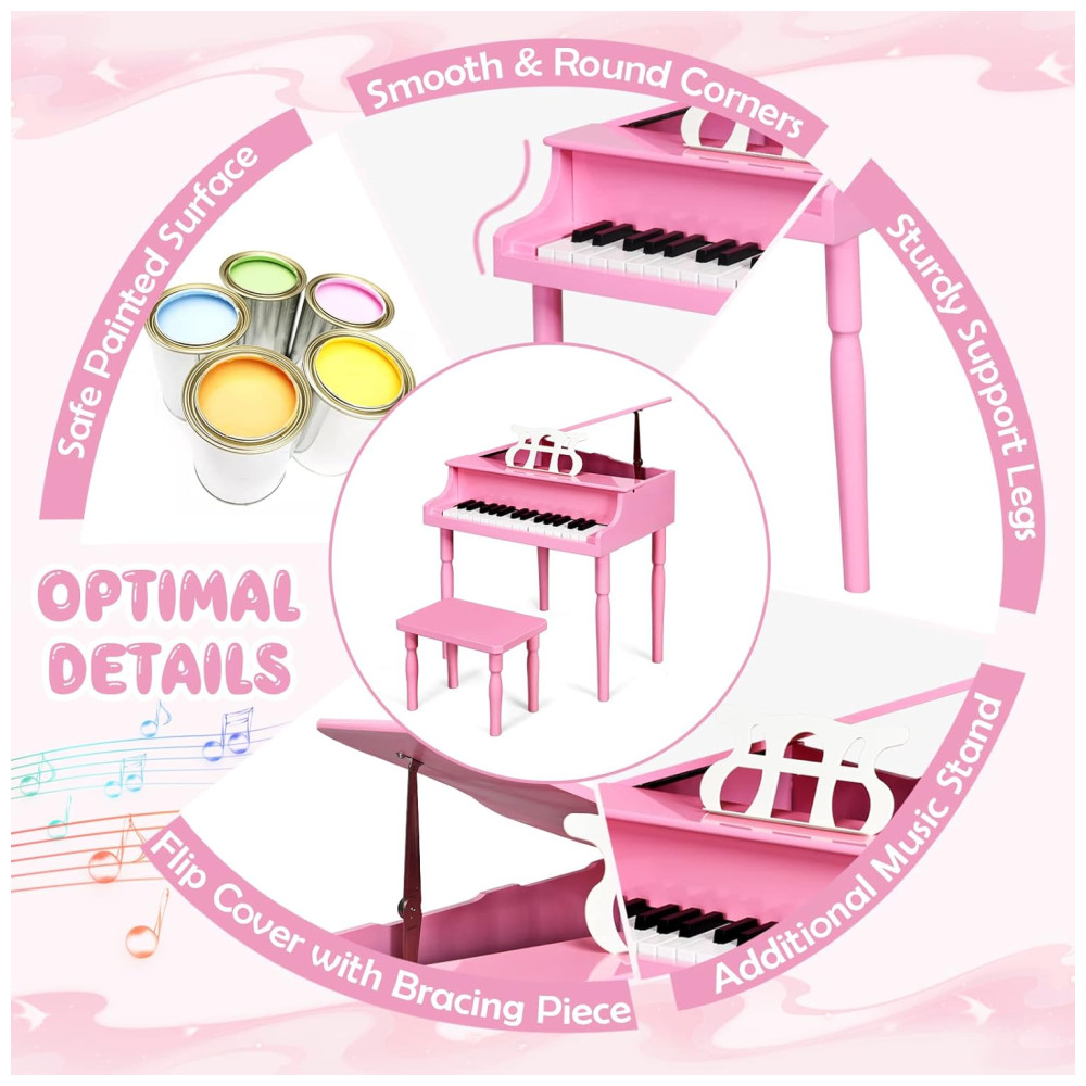 Piano Clássico Infantil com 30 Teclas Banco Tampa de Piano e Suporte para Partitura Goplus Rosa