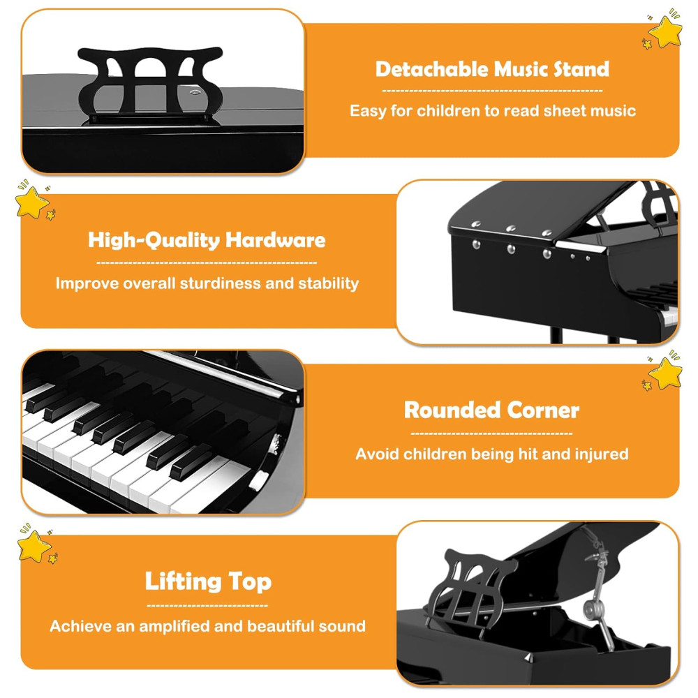 Brinquedo educativo perfeito: O mini piano de cauda vem com um banquinho confortável para as crianças sentarem, para que possam brincar com mais conforto. Além disso, projetado com um suporte para partitura funcional, as crianças podem aprender a tocar piano com maior eficiência.