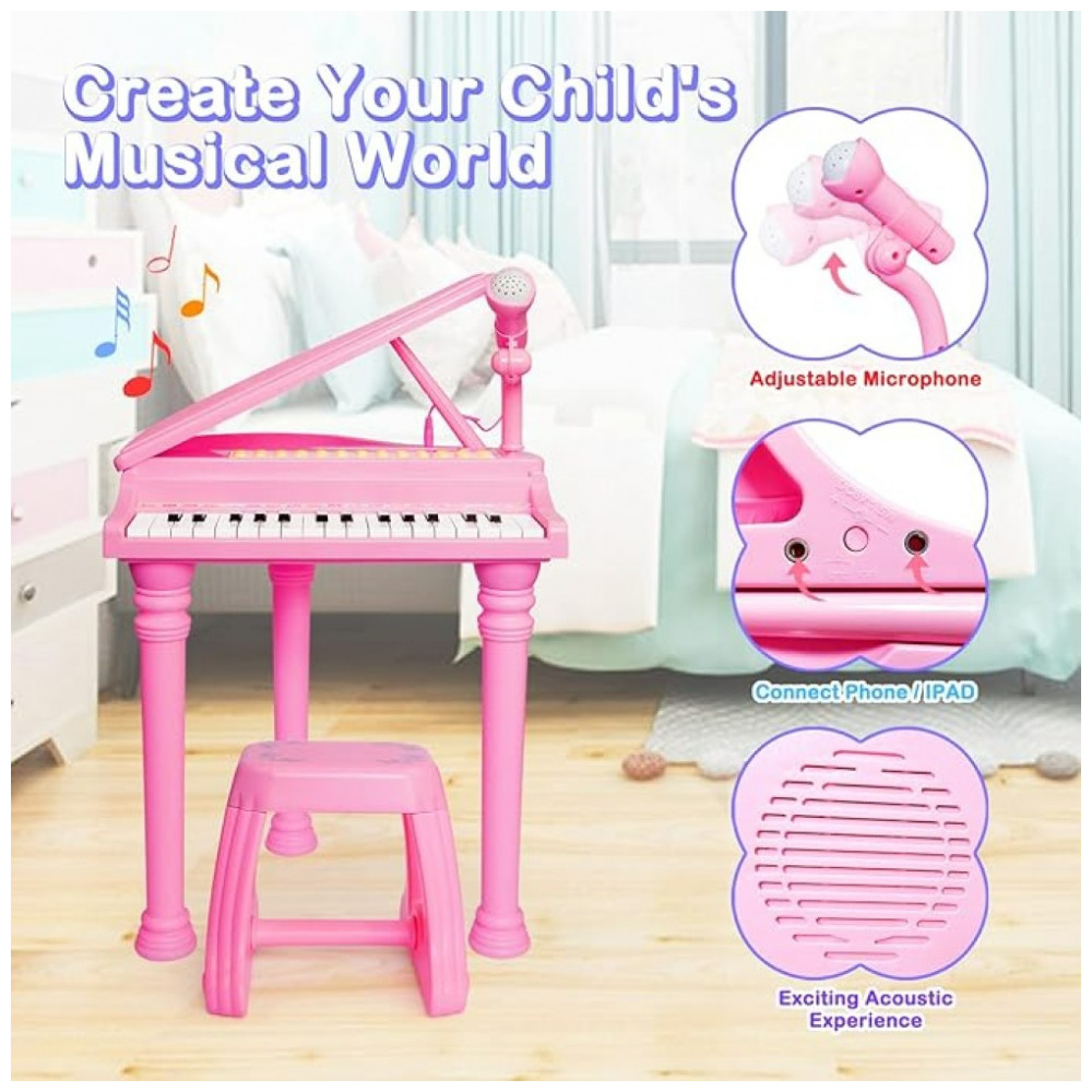 Este teclado de piano para bebês para crianças vem completo com um microfone removível para cantar junto e um banco redondo correspondente