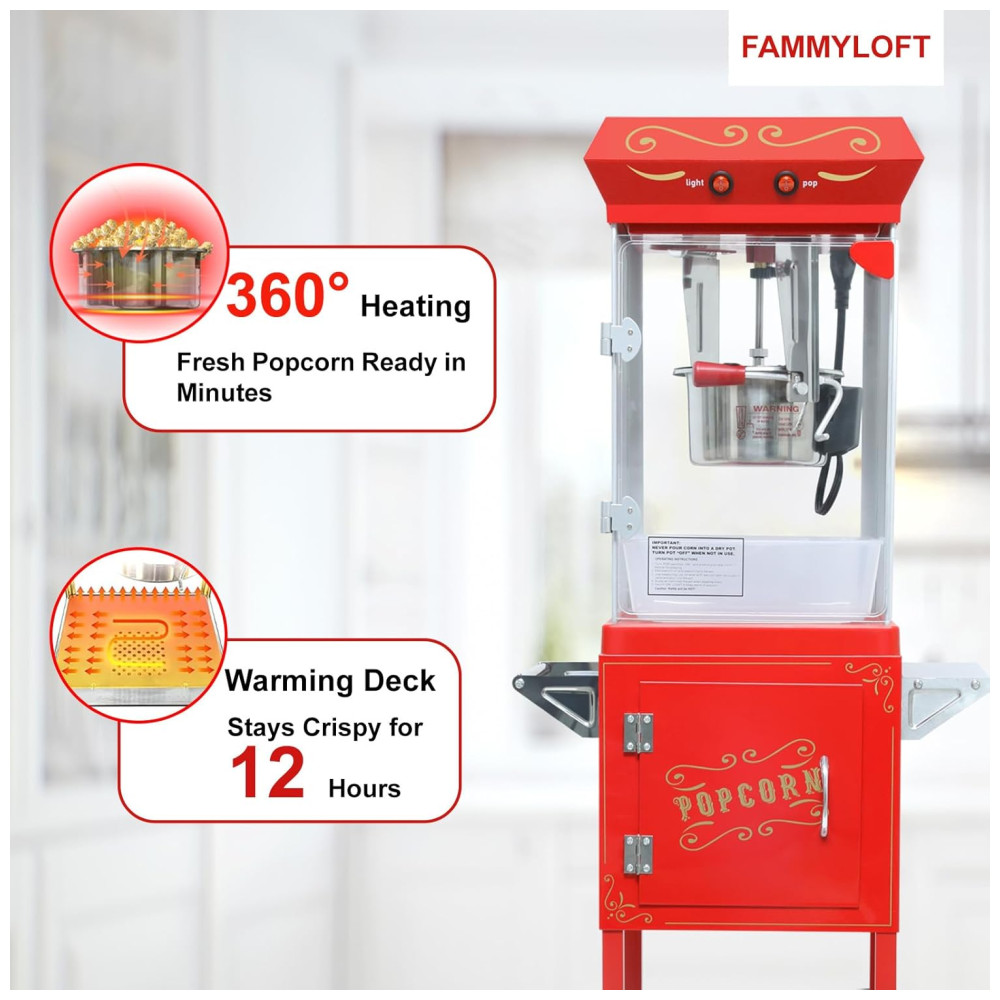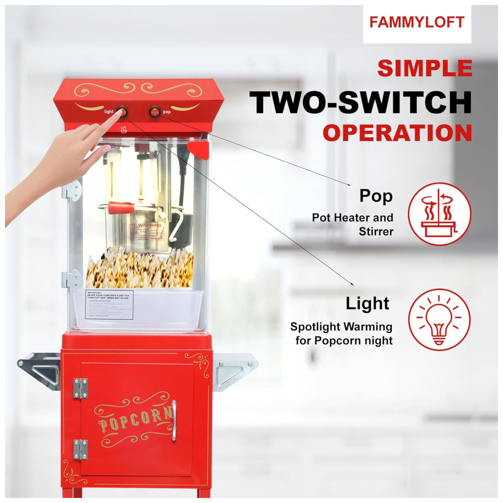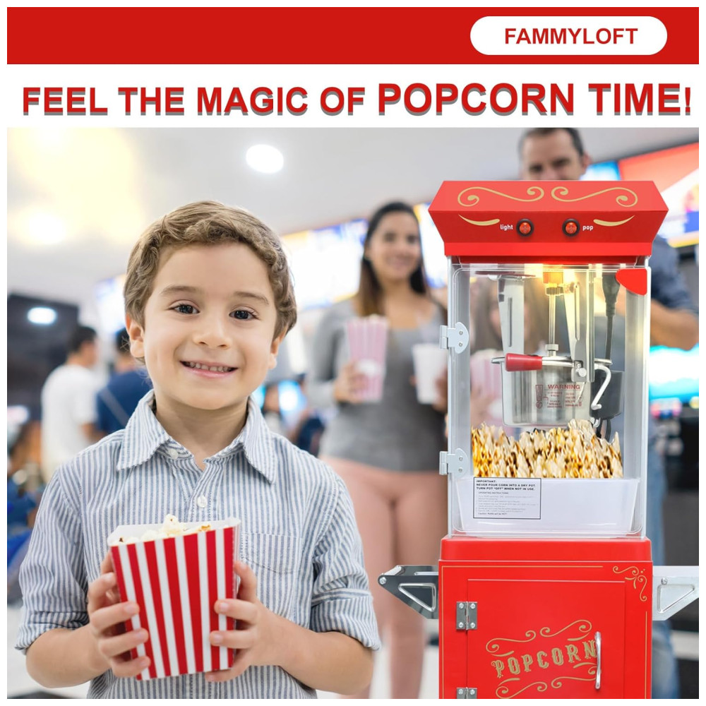 Transforme sua casa em um verdadeiro cinema com a Máquina de Pipoca da FammyLoft. Desfrute de pipocas frescas e deliciosas com este equipamento, que conta com um resistente sistema de aquecimento de 480W e um deck aquecido para manter a pipoca quentinha. A gaveta coletora de grãos não estourados facilita a limpeza. Ideal para home theaters, noites de filmes e festas. O design vintage e o carrinho móvel trazem o charme retro para a sua casa, com rodas, armário para suprimentos e prateleira para servir com facilidade. Operação eficiente e amigável ao usuário, com zonas de alimentos em aço inoxidável para durabilidade. Controle independente da luz de aquecimento e do aquecedor de panela, garantindo uma experiência perfeita. Versátil para qualquer ocasião, com capacidade de 24 copos por lote. Uma adição durável e estilosa para qualquer espaço, feita de metal e aço inoxidável de alta qualidade, com um vibrante acabamento vermelho.