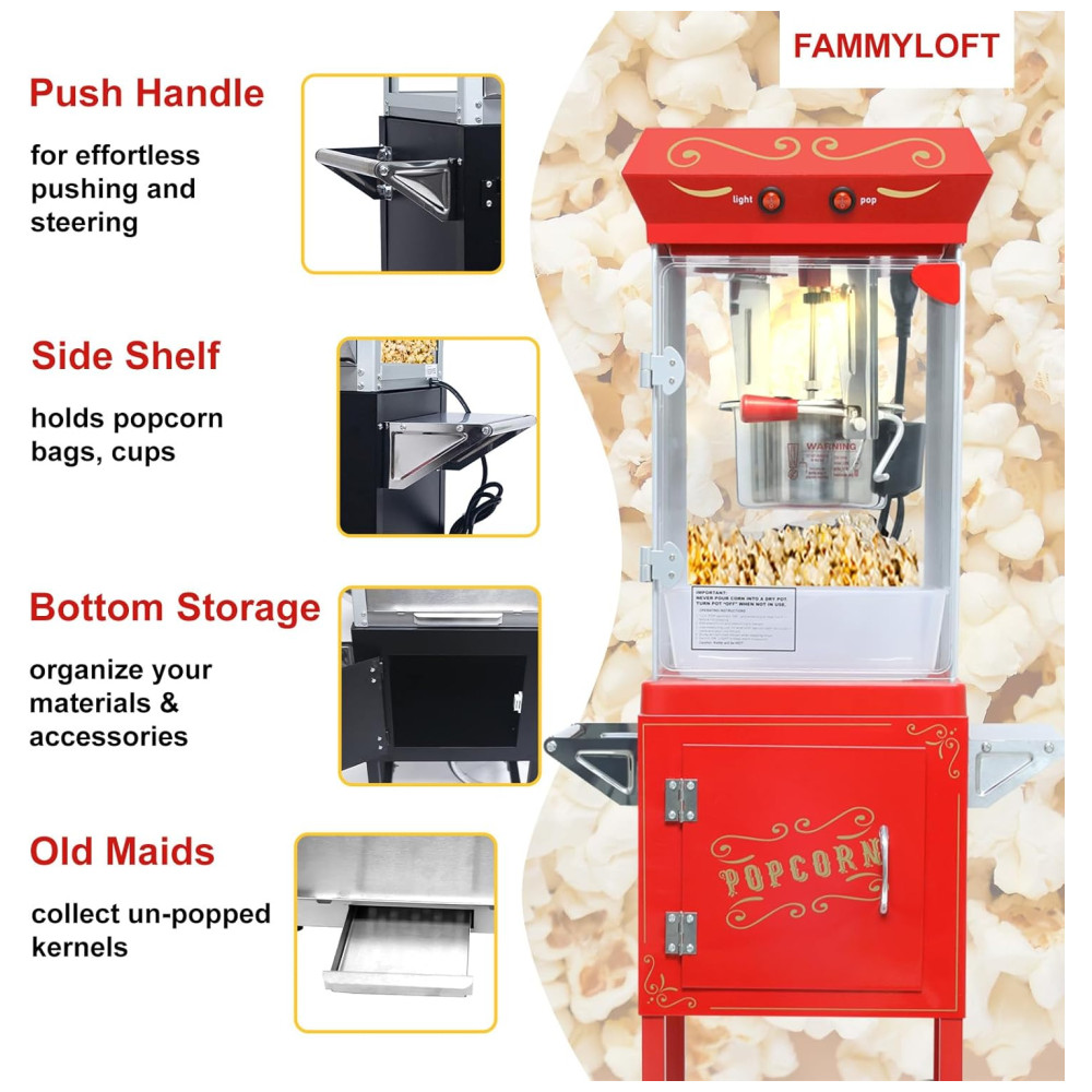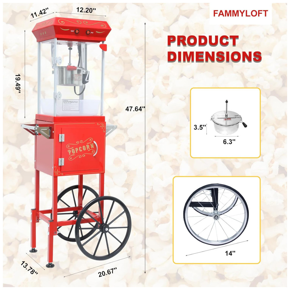 Pipoqueira com Carrinho Design Vintage e Acabamento em Aço Inoxidável Gaveta Coletora 24 Copos por Lote VermelhaFammyLoft