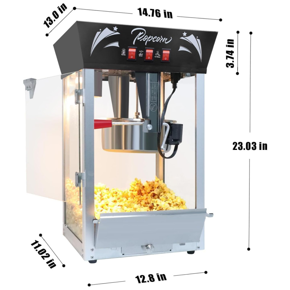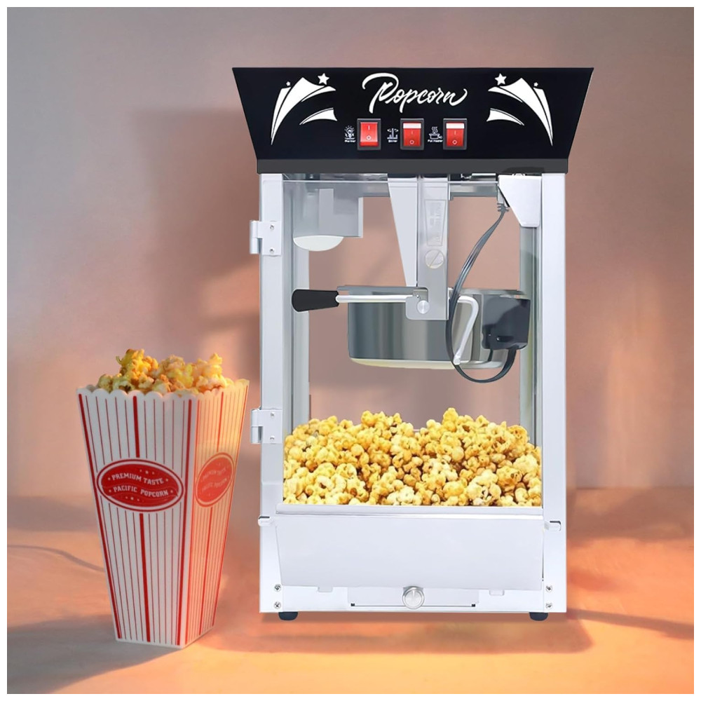 Desfrute de pipoca fresca e quente com um toque nostálgico com esta máquina de pipoca comercial. Com sistema de aquecimento de 850W e caldeira de aço inoxidável, ela produz até 40 xícaras por fornada, servindo de 10 a 12 pessoas. Feita com aço inoxidável 304, vidro temperado e estrutura resistente, esta máquina de pipoca preta é durável e elegante. As portas de vidro temperado permitem que você acompanhe o processo de estouro de milho com segurança, tornando-a uma escolha confiável para uso frequente. Com um sistema de controle de 3 interruptores para operação independente do deck de aquecimento, agitador e aquecedor de caldeira, esta máquina de pipoca conta ainda com luz LED embutida para iluminar a pipoca, criando uma atmosfera cinematográfica em seu espaço. Projetada para conveniência, inclui caldeira removível e bandeja de migalhas para limpeza sem esforço. Receba uma xícara medidora de 12 xícaras em aço inoxidável, colher de sopa e pegador de pipoca para uma experiência de lanche perfeita. Com um motor de 850W silencioso, é ideal para ambientes domésticos e compartilhados. Dimensões do produto: 37,34cm x 32,84cm x 58,54cm.