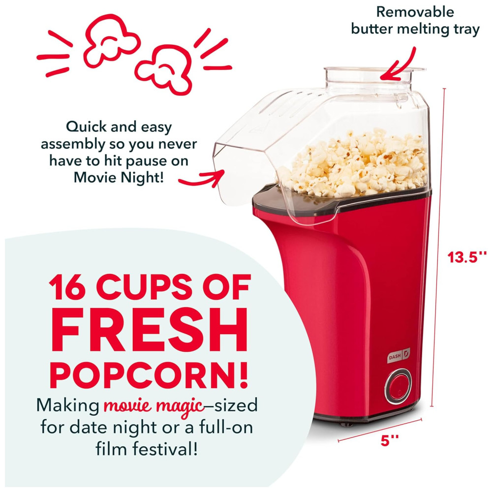 Pipoqueira DASH Hot Air Popcorn Popper Maker com Copo Medidor para Porcionar Pipocas e Derreter Manteiga 16 Copos Vermelha