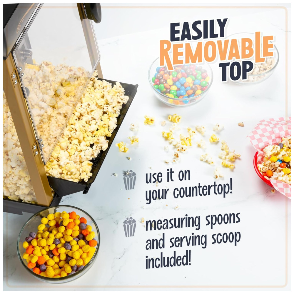 Este suporte vintage para máquina de pipoca é perfeito para quem quer preparar uma pipoca deliciosa em casa, seja na hora do cinema ou no lanche. Com capacidade para abrir até 10 xícaras de pipoca de cinema por lote, você pode manter os baldes de todos cheios. Todos os kits de pipoca Nostalgia funcionam com esta máquina de pipoca, inclusive o kit de chaleira de ar quente para teatro, óleo de pipoca, pacotes de temperos, tigelas de pipoca reutilizáveis e o kit de pipoca de óleo de coco pré medido.