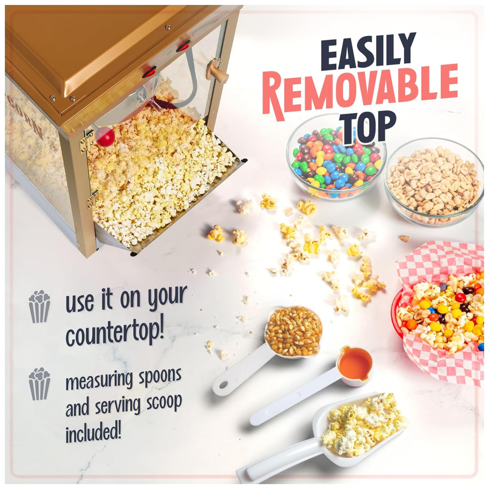 As janelas de vidro temperado resistem a quebras, arranhões e calor, garantindo a segurança da sua família. O compartimento superior do carrinho pode ser facilmente removido para uso na bancada da cozinha. Todos os kits de pipoca Nostalgia podem ser usados com esta máquina de pipoca, incluindo o kit de chaleira de ar quente para teatro, óleo de pipoca, pacotes de temperos, tigelas de pipoca reutilizáveis e o kit de pipoca de óleo de coco pré medido.