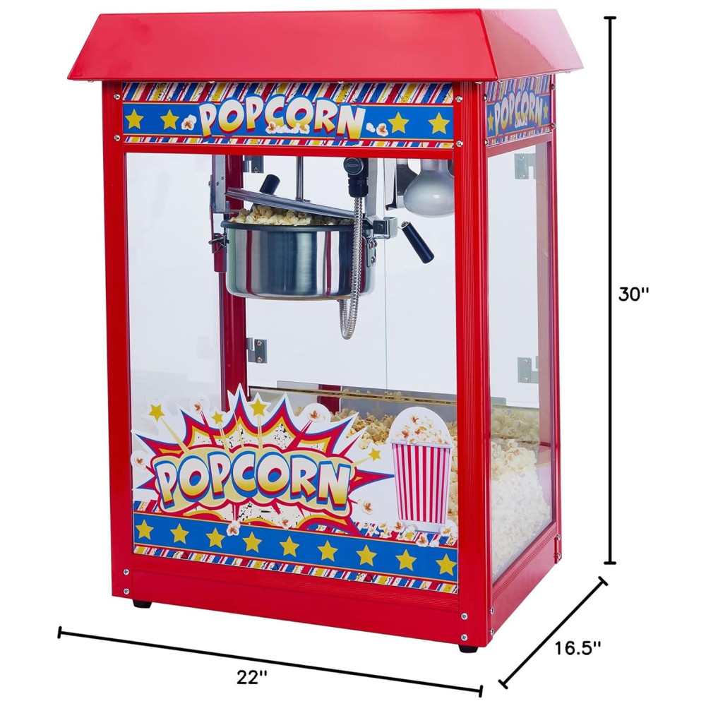 A máquina também possui uma bandeja removível para migalhas que desliza para facilitar a limpeza. Com interruptores de controle iluminados para motores de luz, aquecimento e giro, essa máquina de pipoca de nível comercial é capaz de produzir pipocas deliciosas e atrativas. Suas dimensões totais são de 55,88 cm x 4094,48 cm x 76,20 cm e funciona com 120V e 60Hz, 1350W, 12A.