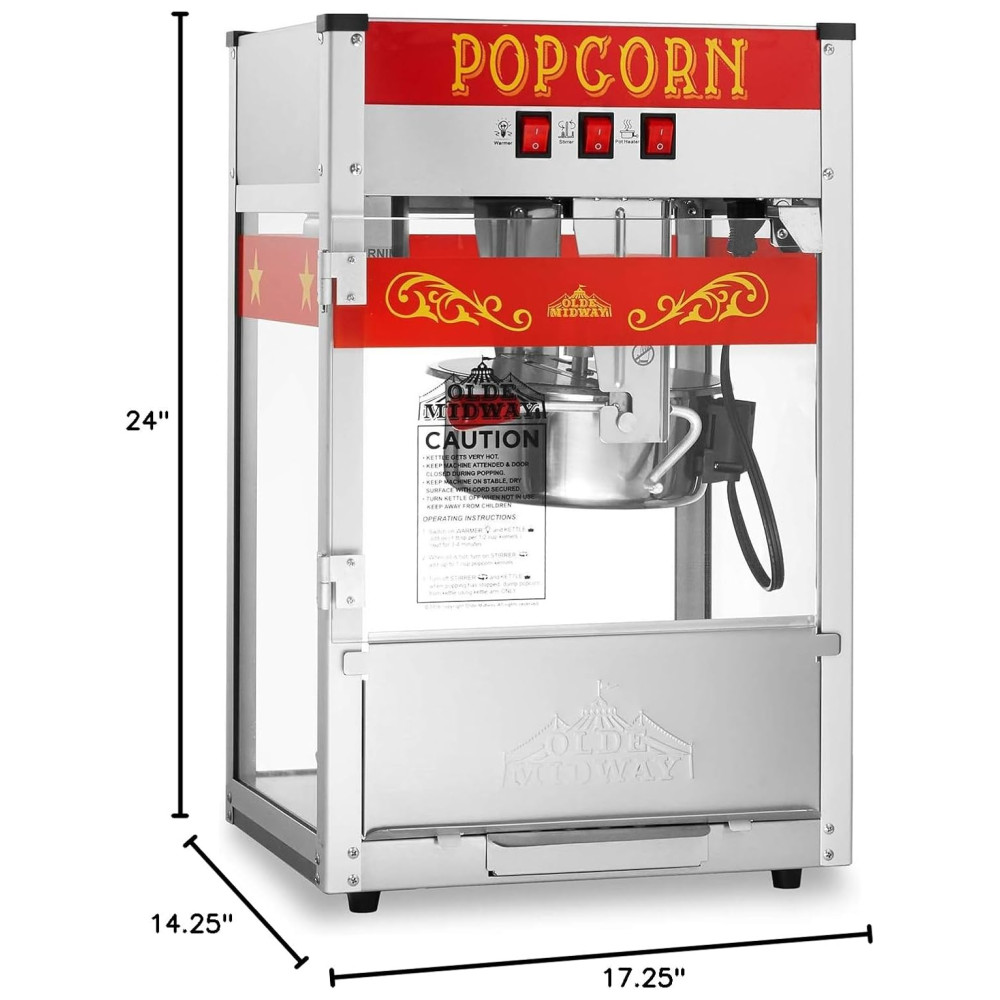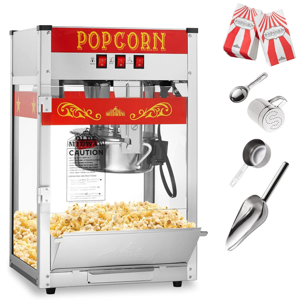 Faça pipoca gourmet estilo cinema em qualquer lugar com a máquina de pipoca Olde Midway. Com design retrô e recursos modernos, esta máquina de pipoca de qualidade comercial pode produzir cerca de 10 kg de pipoca por lote para atender grandes multidões. Ideal para escolas, igrejas, empresas, festas, jogos da liga infantil e do time do colégio, cinemas domésticos e muito mais.