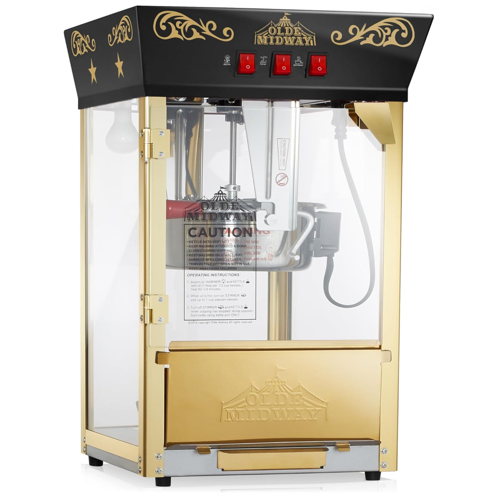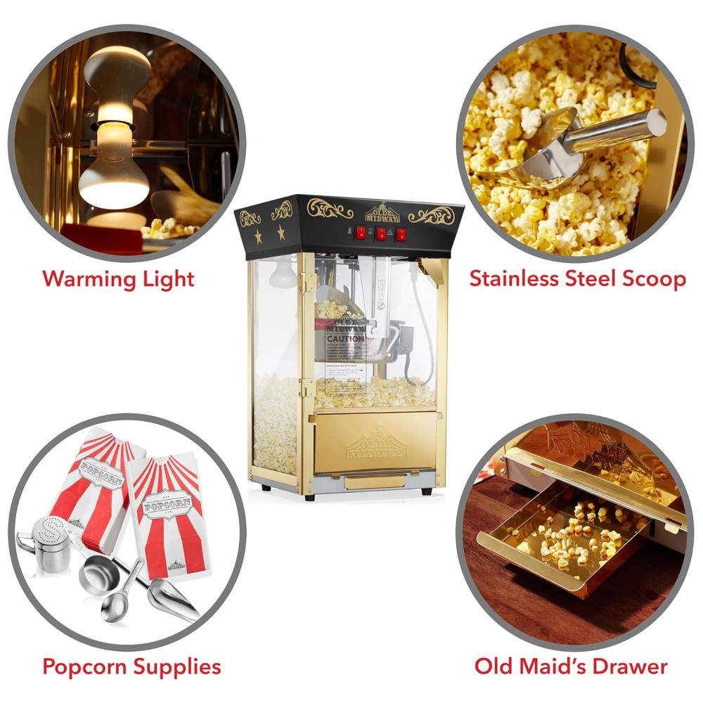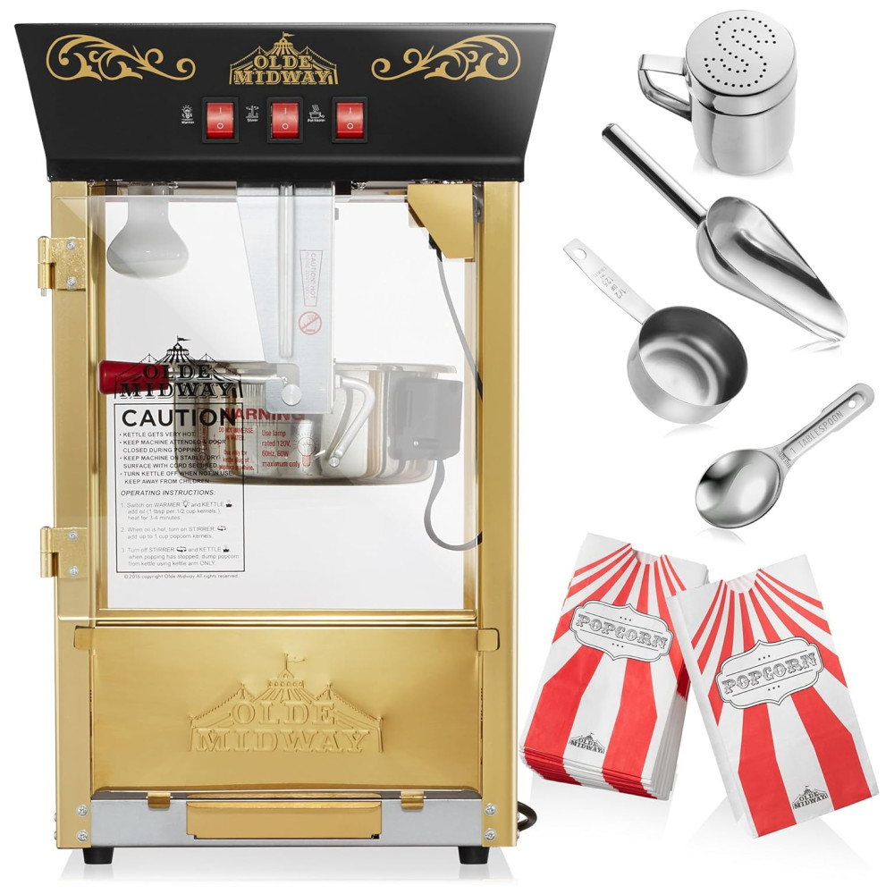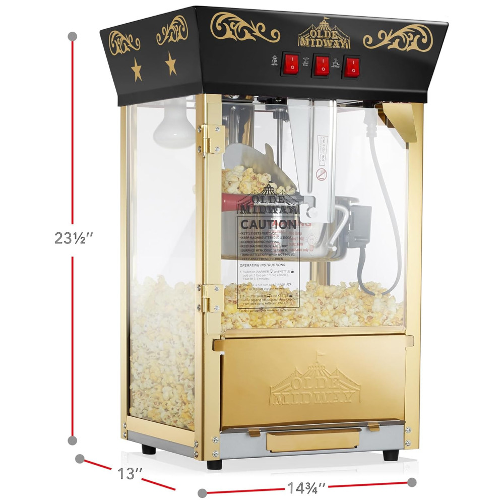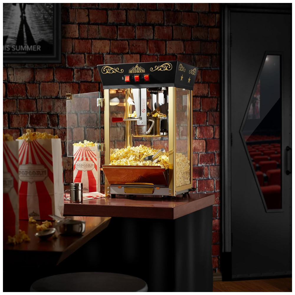 A máquina de pipoca de bancada Olde Midways é perfeita para quem busca um apelo nostálgico aliado a recursos modernos. Com uma chaleira de aço inoxidável de 0,35 gramas, ela produz cerca de 15L de pipoca estilo cinema por lote, ideal para uso em home theaters, eventos escolares, festas de aniversário e muito mais.