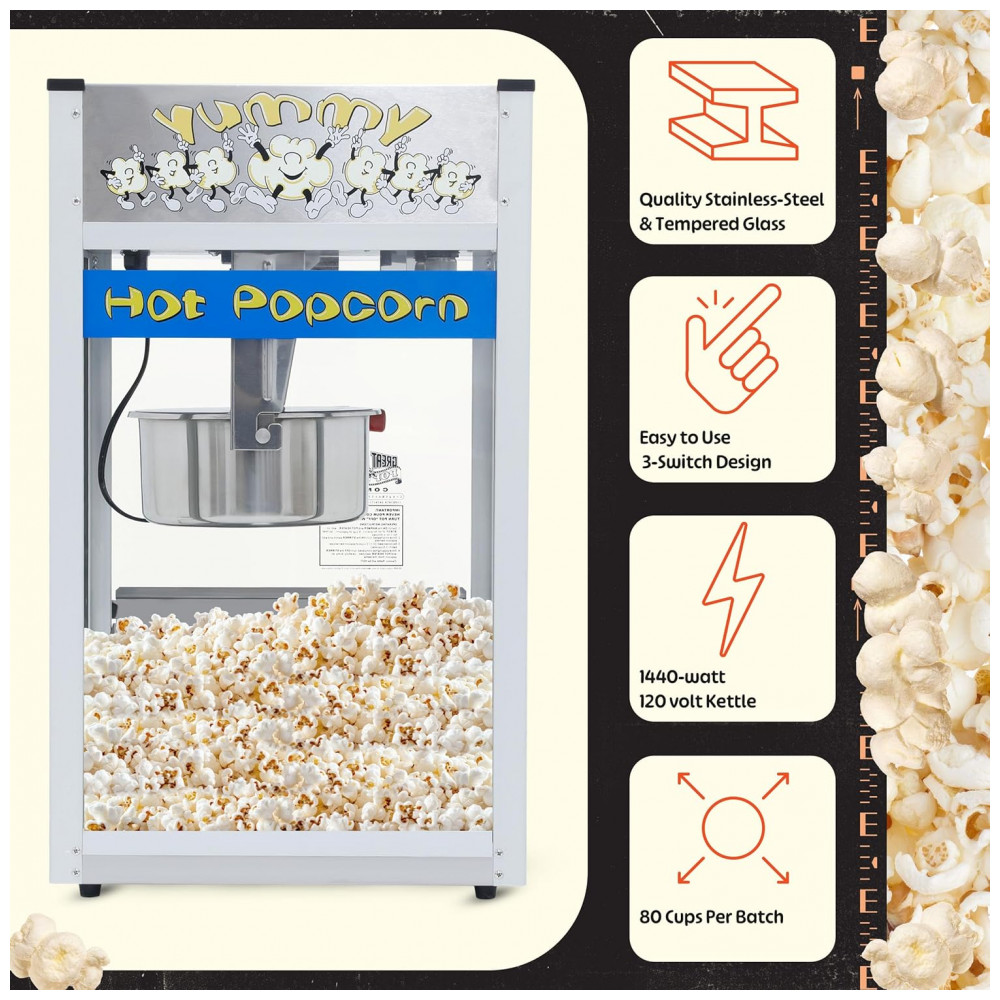 A chaleira de 1350 watts aquece a pipoca mais rápido do que outras máquinas e o tamanho maior comporta muito mais pipoca. A máquina apresenta zonas de alimentação em aço inoxidável, chaleiras em aço inoxidável de fácil limpeza, uma plataforma de aquecimento exclusiva, gavetas antigas para grãos não estourados, painéis de vidro temperado e uma chaleira líder do setor de 0,42 gramas operando com 1350 watts.