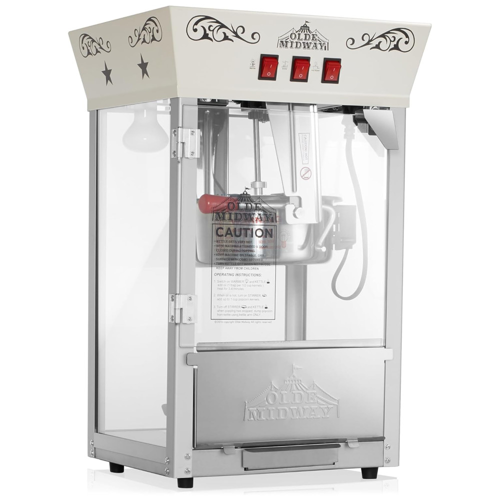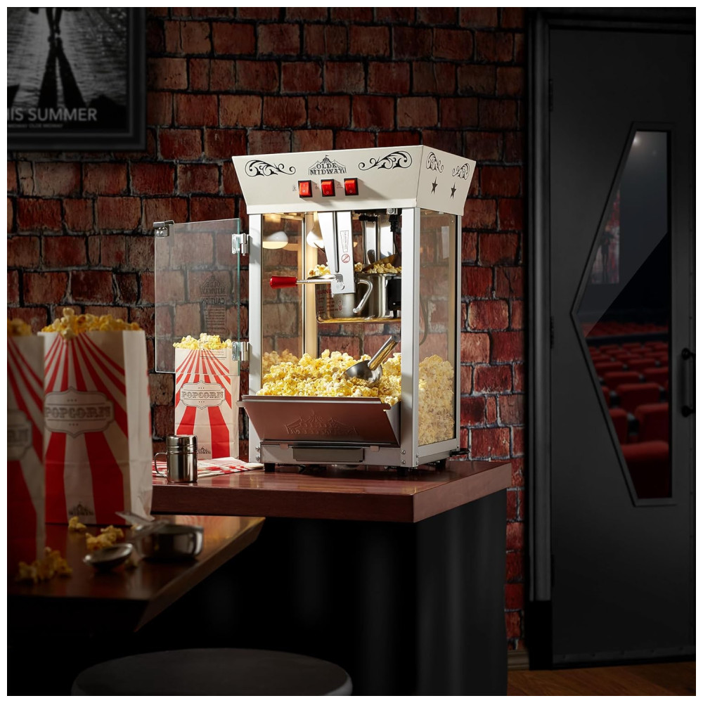 A máquina de pipoca de bancada Olde Midways possui um design nostálgico e recursos modernos para produzir pipocas estilo cinema. Com uma grande chaleira de aço inoxidável, é capaz de produzir cerca de 10,8 kg por lote, tornando a ideal para uso em home theaters, empresas, eventos escolares, festas de aniversário e muito mais.
