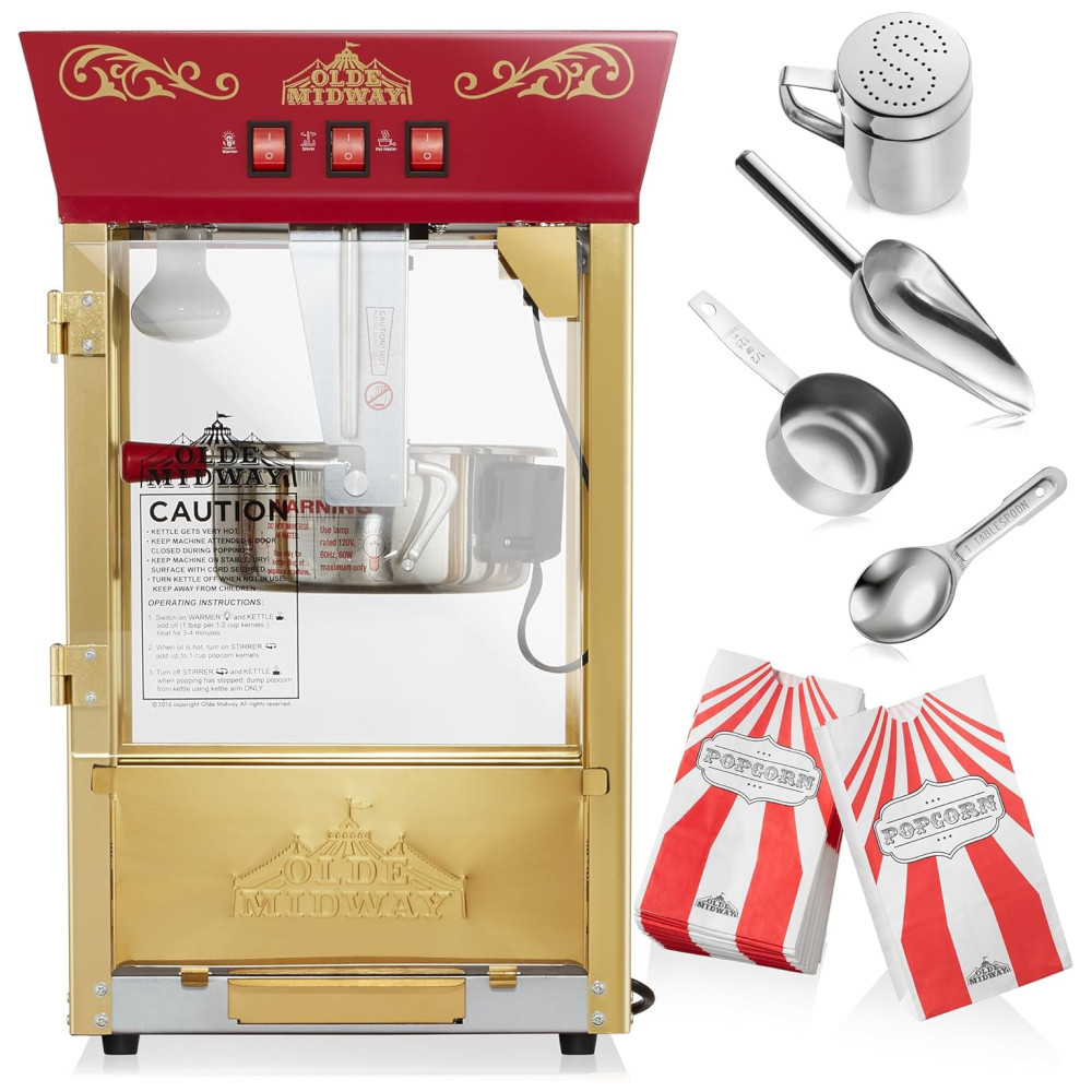 A máquina de pipoca de bancada Olde Midways possui um design nostálgico com recursos modernos. Com uma grande chaleira de aço inoxidável de 0,28 gramas, é capaz de produzir cerca de 10,8 kg de pipoca estilo cinema por lote, tornando a ideal para uso em home theaters, empresas, eventos escolares, arrecadação de fundos, festas de aniversário e muito mais.