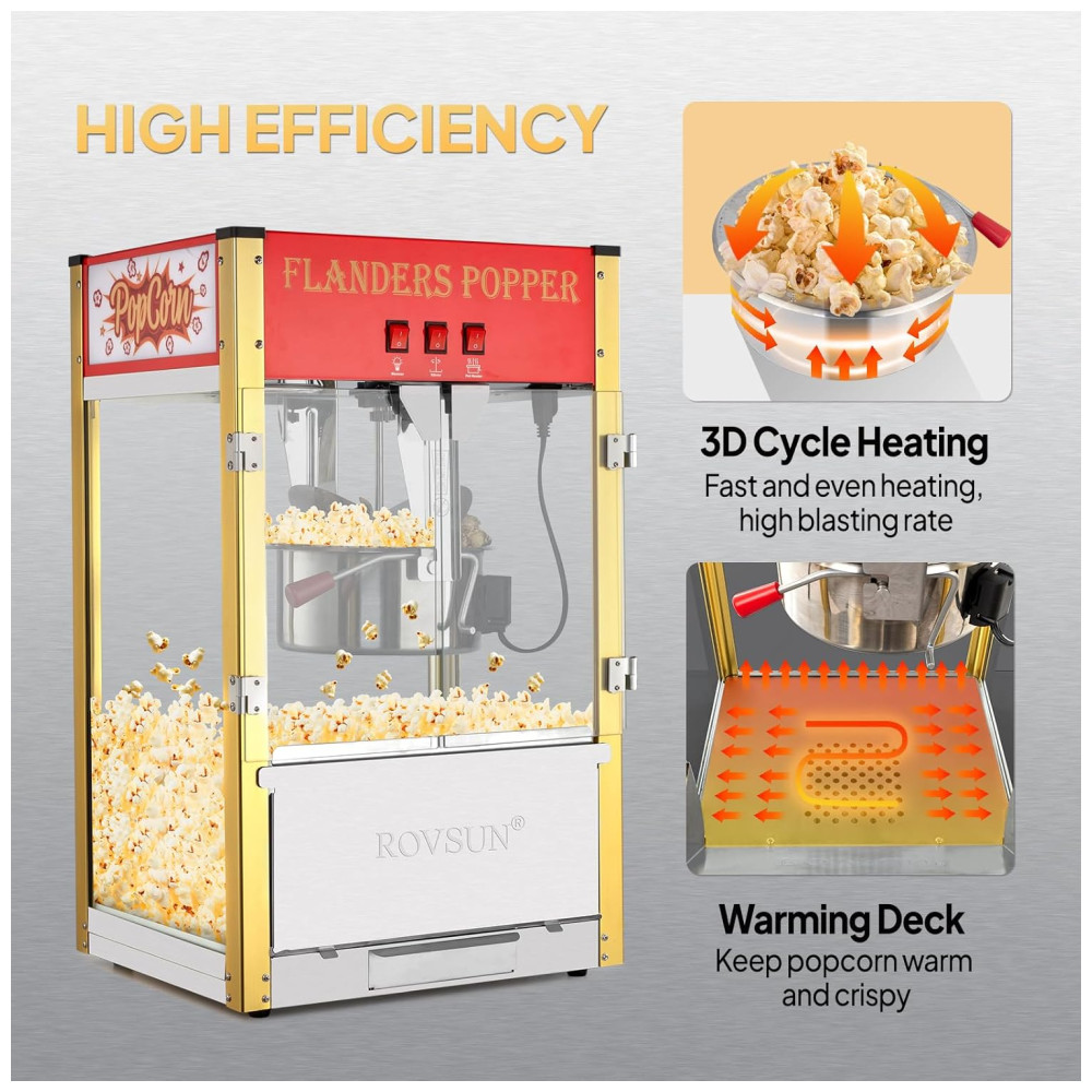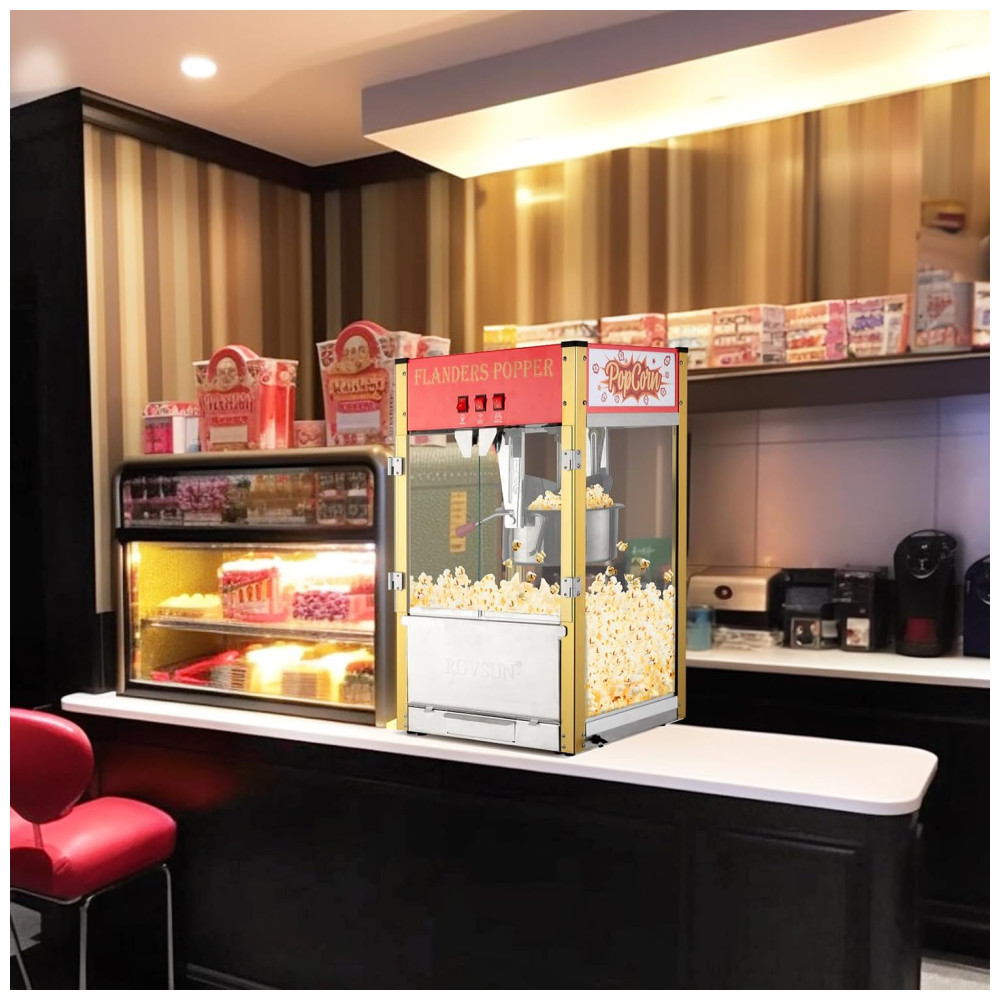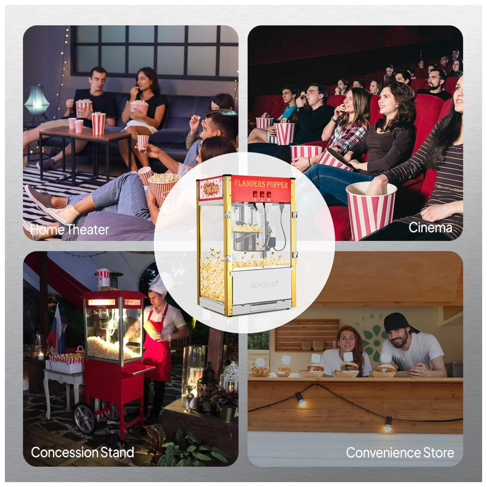 A máquina é ideal para uso doméstico e comercial em cinema, home theater, festas, etc. Também vem com acessórios, como 1 colher de pipoca, 1 colher medidora de óleo, 1 colher medidora de milho, 3 copos de pipoca e 1 agitador de energia.