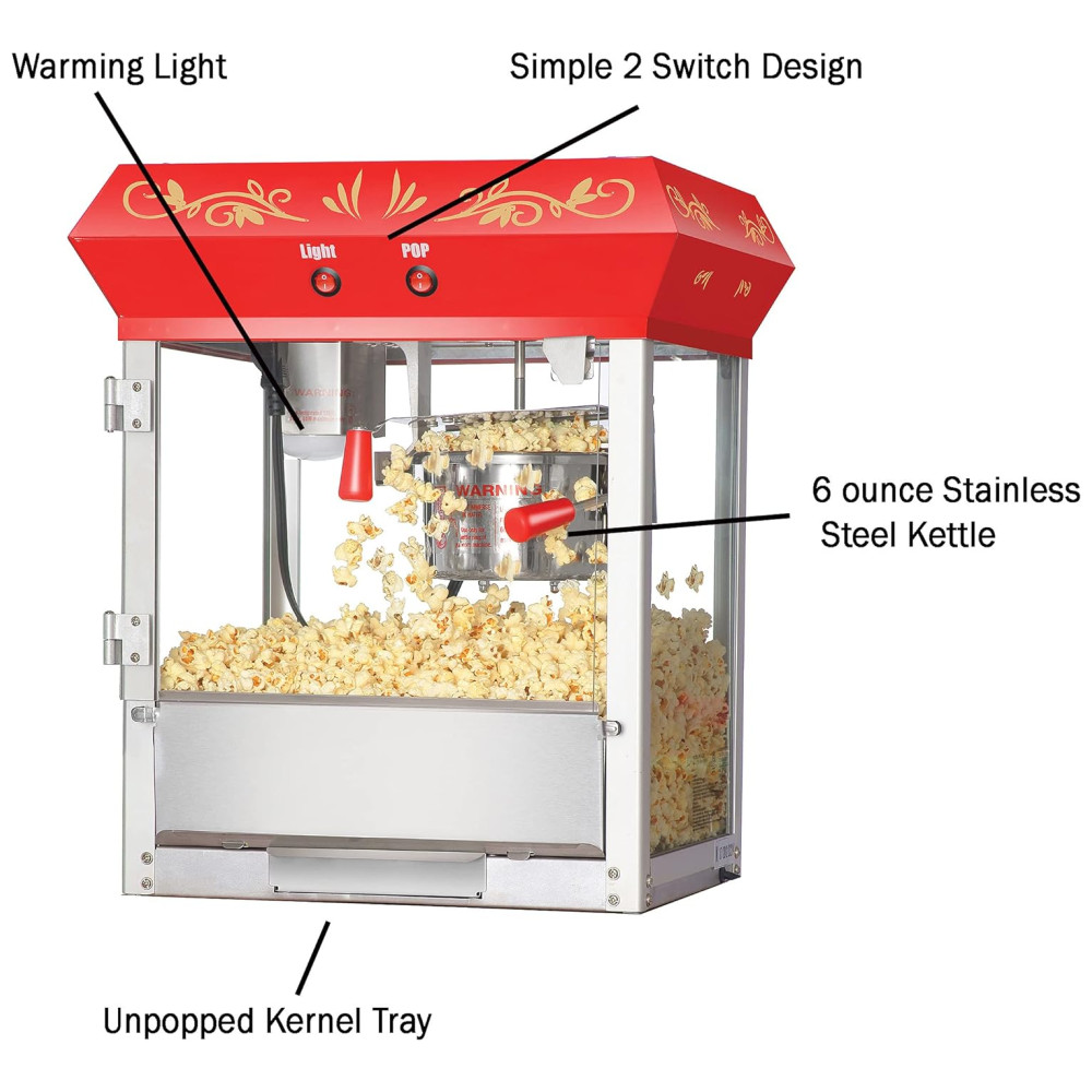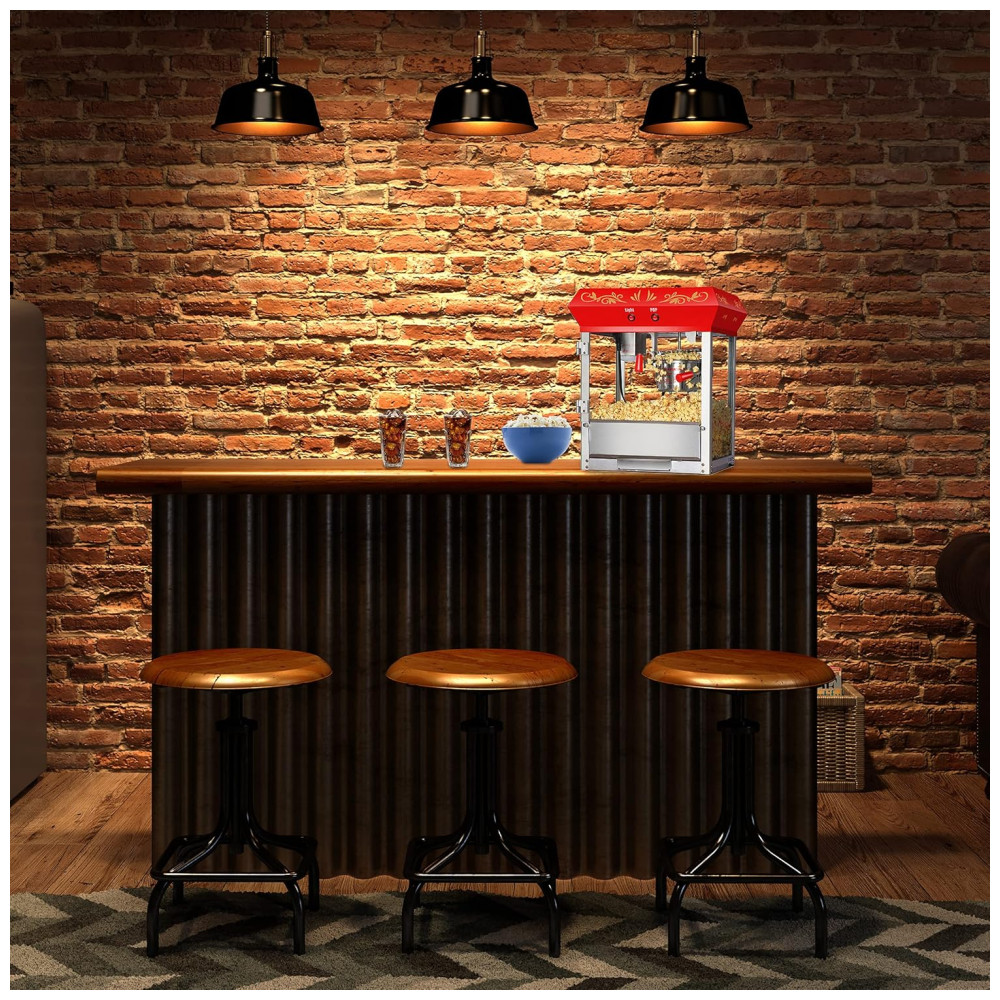 A plataforma aquecida mantém a pipoca fresca e a gaveta de solteirona facilita a limpeza. O design vintage atemporal é divertido e nostálgico, agradando a todos em noites de cinema, festas de aniversário ou pequenos escritórios.